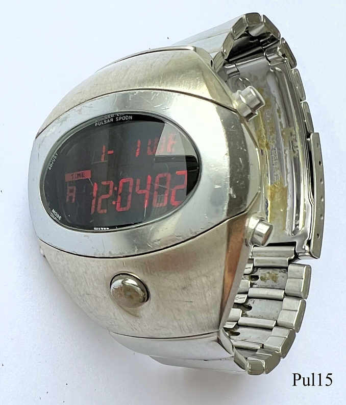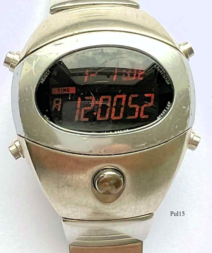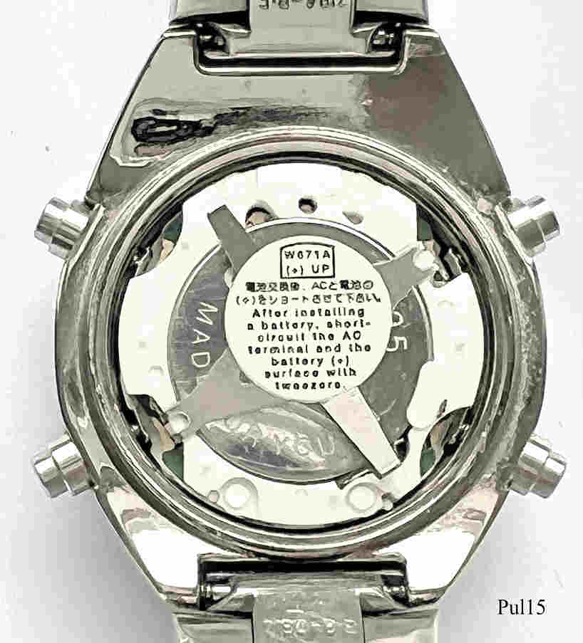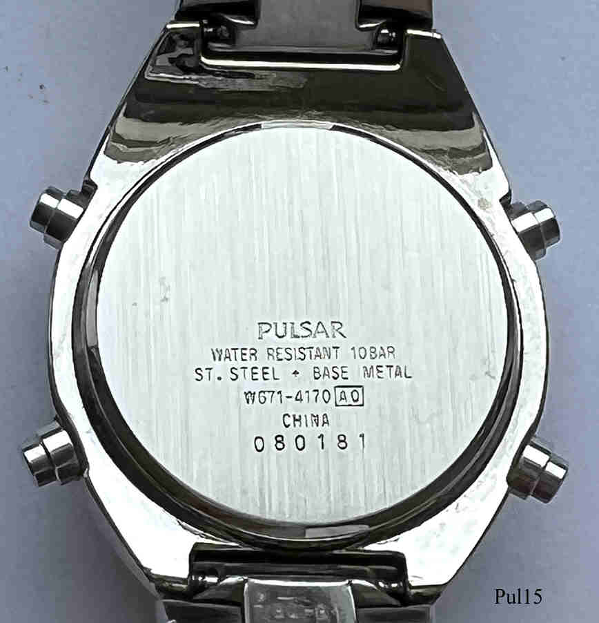 Ein Pulsar Herren Digital Chronograph mit LCD Anzeige. Beschriftet vorn: “ ”, hinten: ”Pulsar,Water Resistant 10 Bar, St. Steel - Base Metal, W671-4170 A0, China, 080181”, innen: ”W671A”. Kaliber Pulsar W671A. Base Metall Gehäuse, Edelstahl Glieder Band.