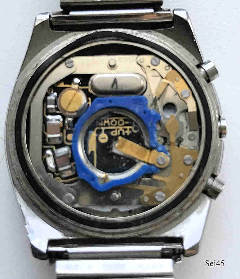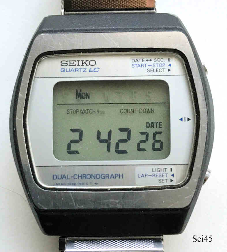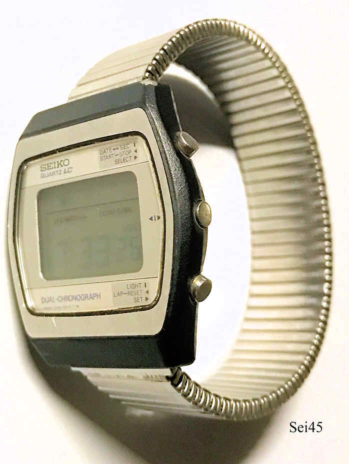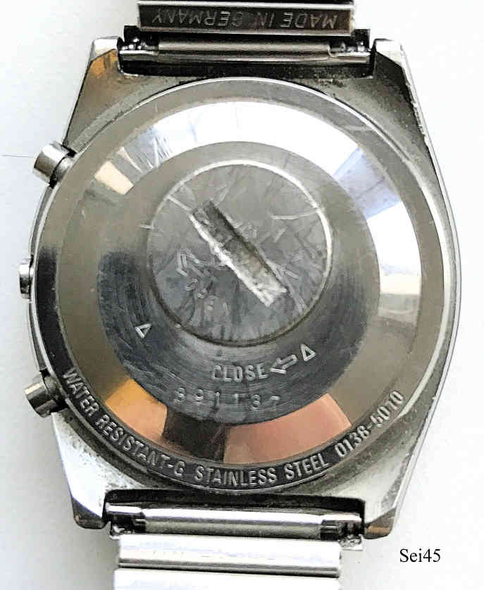 Dies ist ein Seiko Dual Chronograph, eine LCD Digitaluhr mit zweiter Zeitzone und Datum. Beschriftung vorn:” SEIKO, Quartz LLC, Dual Chronograph, Japan, 0138-5010T“, hinten: “Water Resistant, Stainless Steel, 0138-5010, 891137”, innen: “ ”. Base Metal Gehäuse mit Edelstahl Boden und FixoFlex Armband.