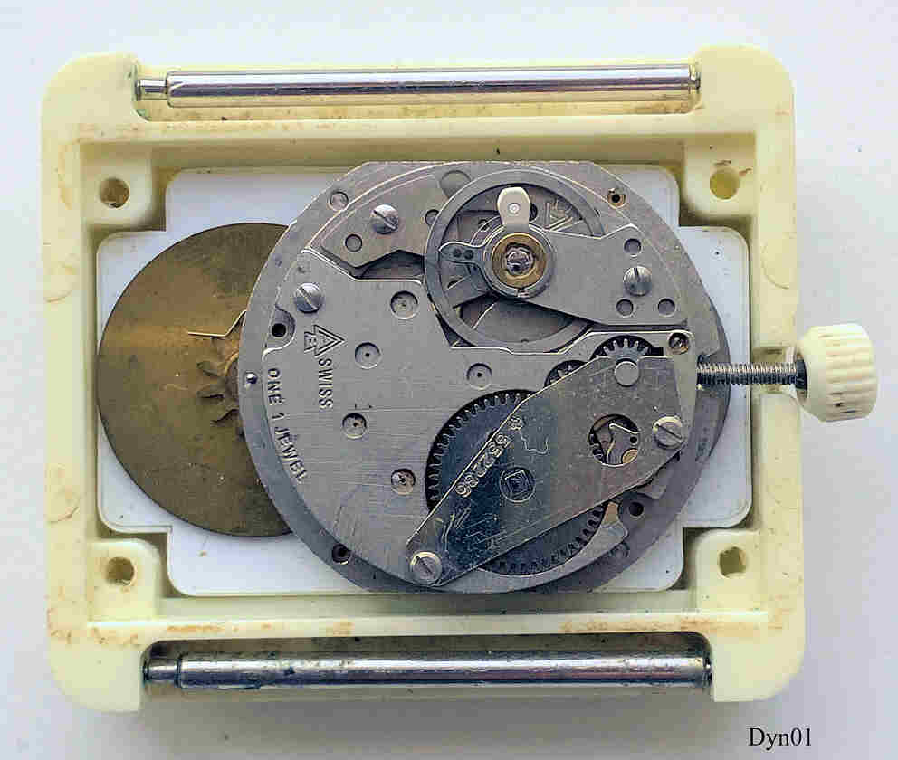 A Dynasty Digital watch with handwind jump-hour Caliber Amida 420, instead of hands two discs, hour- and minute-disc turn around. The time is then read out in a window on the dial. The case is made from the new meterial Delrin, an Acetal-Homopolymer from Dupont. Signed front: ”Dynasty, Swiss”, back: “Base Delrin, U.S.Patent 3685288, Other Patents pending”. |