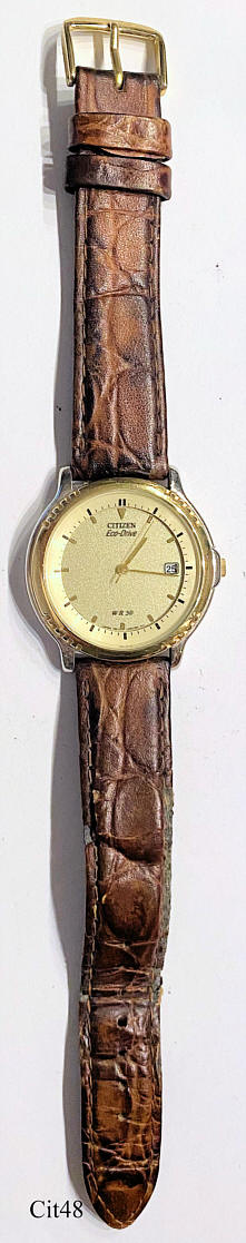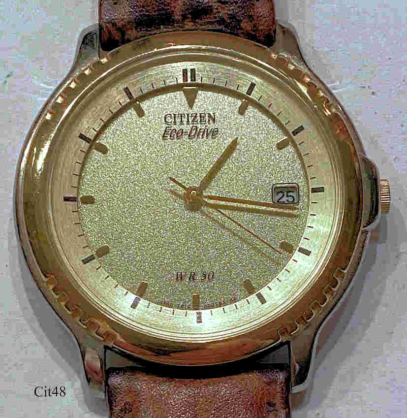 Dies ist eine Citizen Eco-Drive Uhr, Citizen Caliber 7860A, Referenz Nr.: 7810-591955 K, Beschriftet vorn:”CITIZEN, Eco-Drive”, Rückseite:”Citizen Watch Co, Water Resist, Base Metal MPDG, 7810-571622 K 591955, GN-4-S, Japan->4”, innen: ”Citizen Watch Co., No Jewels, 7860A, Japan” Base Metal Gehäuse, Datum bei der 3. Eco drive heißt, daß das Zifferblatt eine Photozelle ist und das Sonnenlicht in elektrische Energie umwandelt, die dann in einem Kondensator GC920 gespeichert wird.