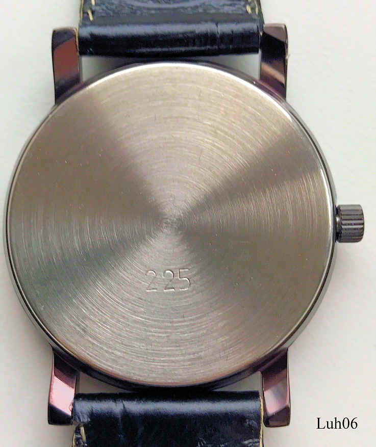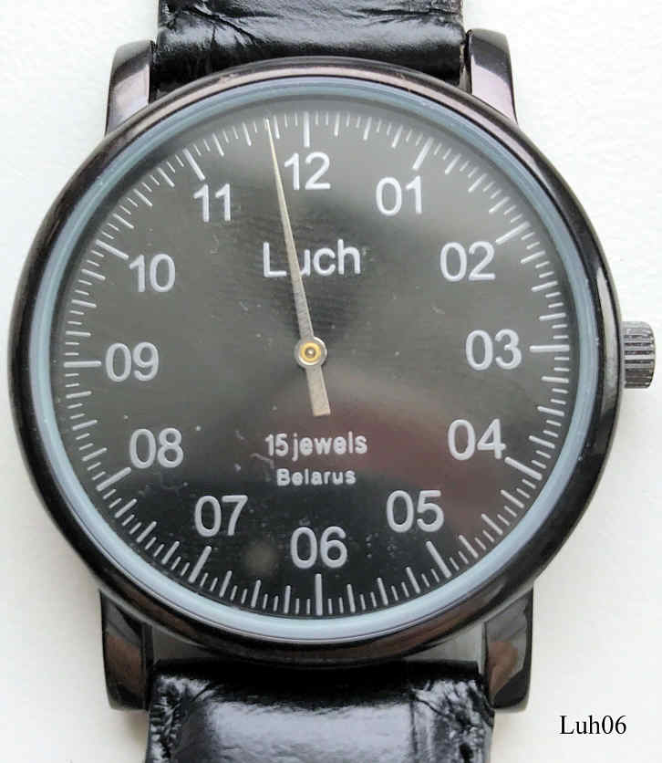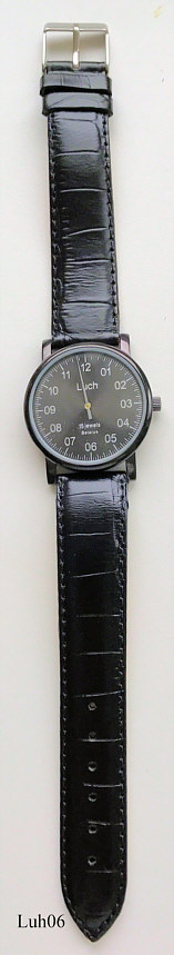 Eine Luch Einzeiger Handaufzugsuhr der Minsker Uhren-Manufaktur in Belarus. Schwarzes Zifferblatt mit weißen Ziffern. Kaliber 1301.1. Beschriftung vorn: ”LUCH, 15 Jewels, Belarus”, innen: ”Logo, BY 1301.1”, hinten: “225”. Schwarzes Lederarmband