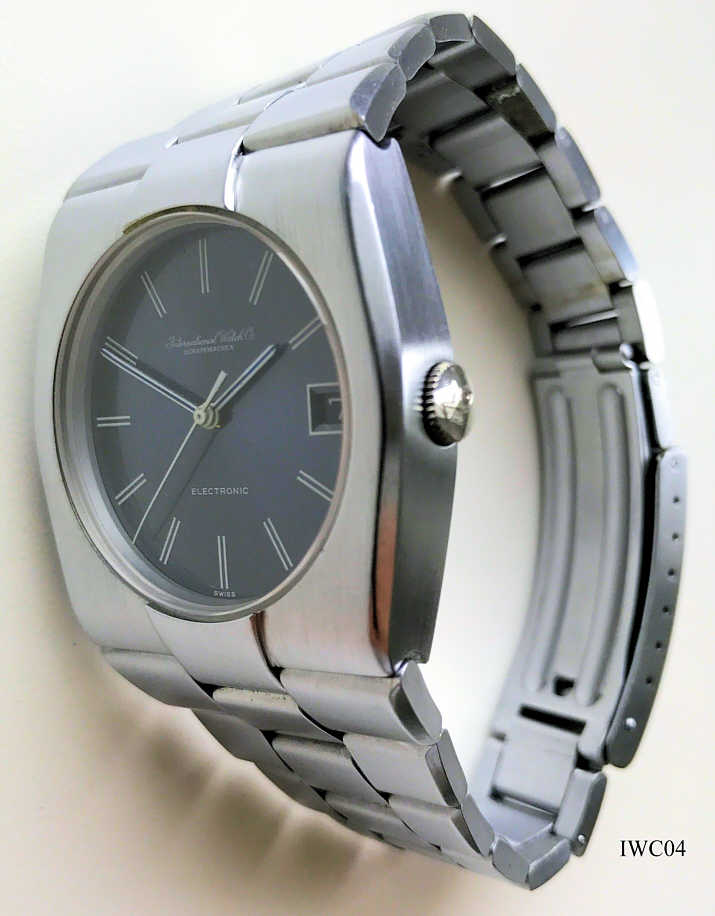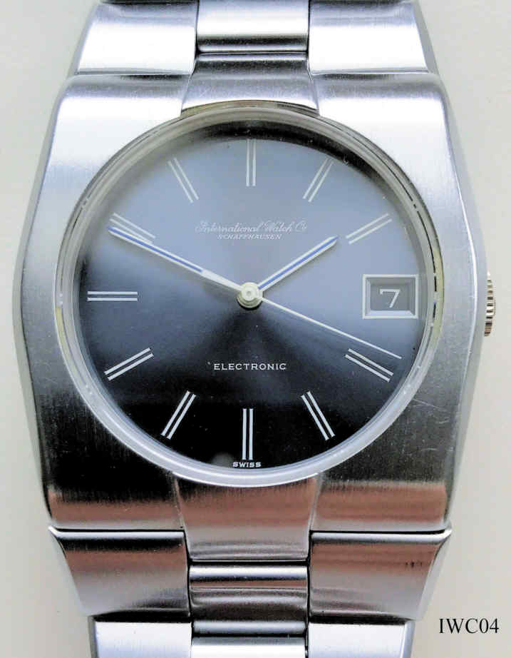 Dies ist eineIWC Electronic mit Edelstahlgehäuse. Das Werk ist ein IWC c.150 (ETA 9162 ), beschriftet vorne: “International Watch Co., Schaffhausen, Electronic, Swiss”, innen: ”IWC c.150,Unadjusted, 2198975”, im Deckel: “N, Metal Durci, Font Acier Inoxydable, 3493, Probus,IWC, Scafusia, 2079604, International Watch Co., Swiss, Movement licensed Bulova and Pat. ETA”.