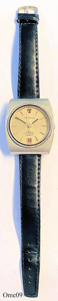 Dies ist eine Omega Electroquartz mit dem Beta21 Werk der CEH. Stainless Steel Gehäuse mit verschraubtem Boden, Datum bei der 6. Beschriftet vorn: “Constellation, Omega, Electroquartz, f8192Hz”, innen: “Thirteen 13 Jewels, Unadjusted, -Swiss-,Omega, 1301, CEH-B21, 34239457”.