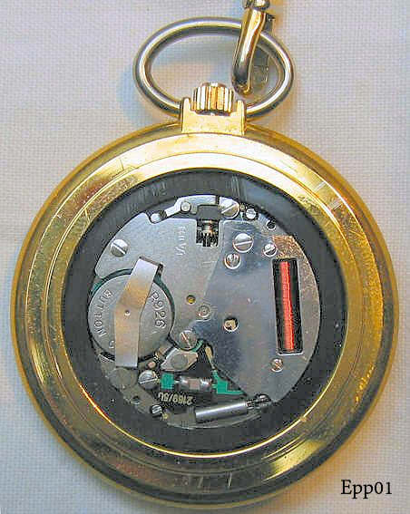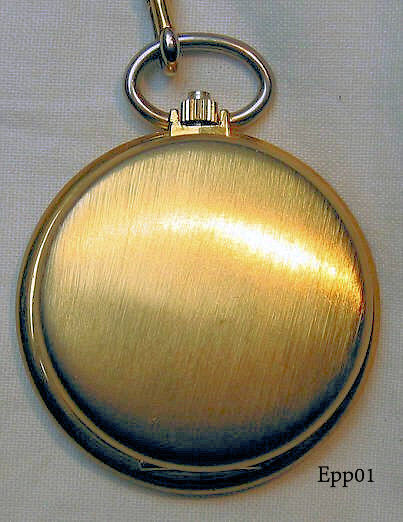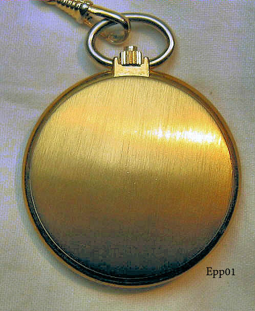 A modern quartz pocket watch with gold tone base metal case.Porcelain dial with roman numbers, central second hand and date at 3. Signed on dial: ”Eppler, Quartz, Made in Germany”, inside: “ISA 1133, 2169/SU”, Cover opens by pressing the crown. Movement ISA 1133.