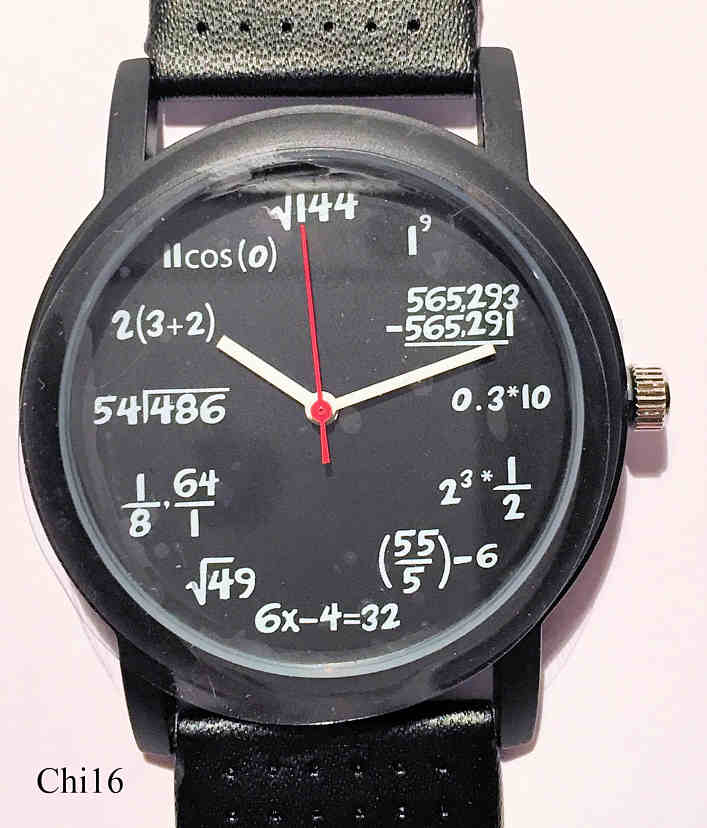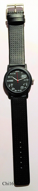 Eine einfache Quartzuhr mit einem witzigen Zifferblatt für Mathe Freaks, die Zahlen werden durch Mathematische Formeln dargestellt. Das schwarze Gehäuse ist aus Base Metal. Beschriftung vorn: ” “€¯, innen: “SIIO, P021”, hinten: ”CE, ThumbsUp!, EQUWAT, Movt Japan, Made in China”€¯. Uhrwerk Kaliber SIIO P021S1, Schwarzes Lederarmband.