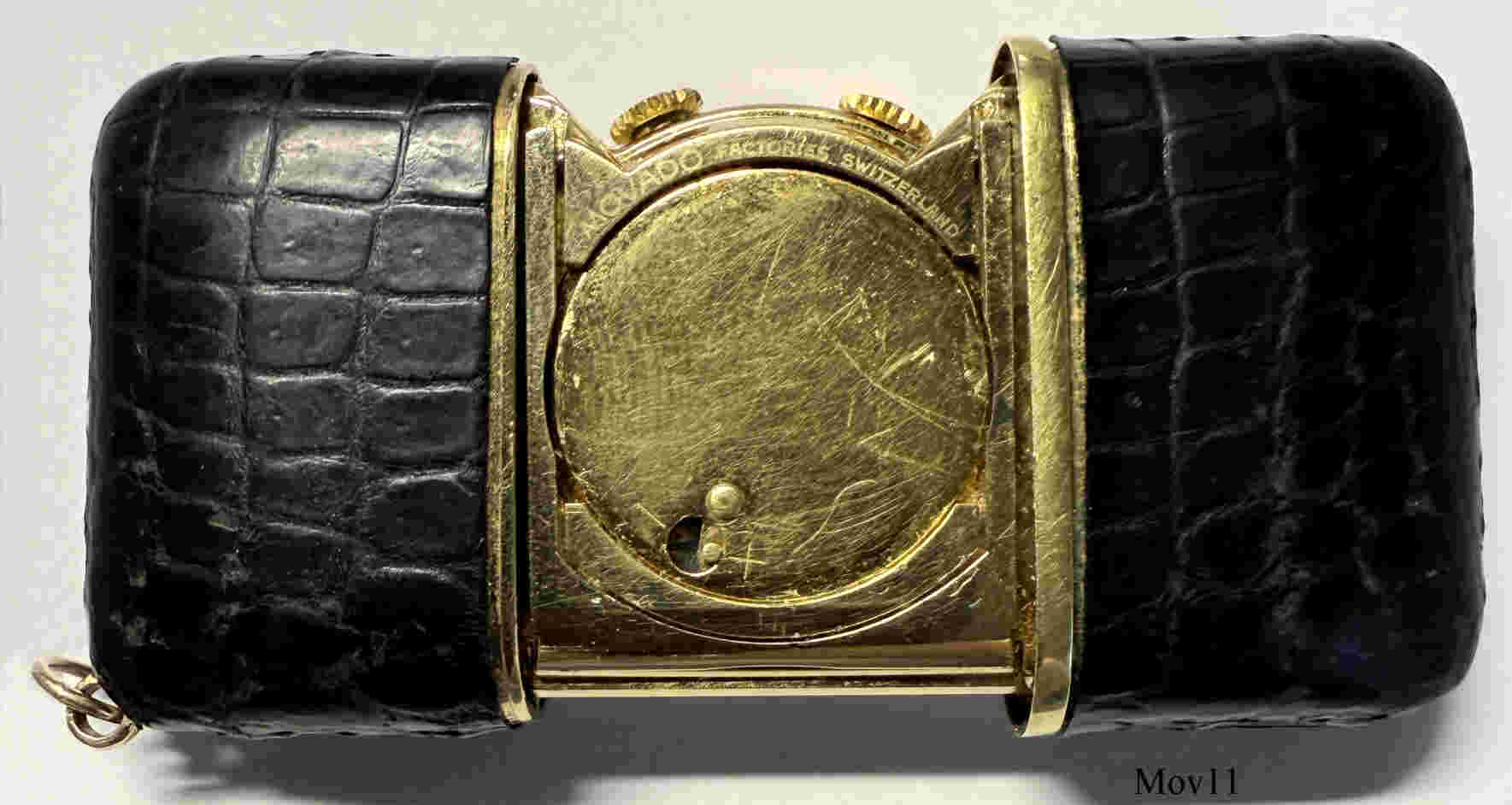 Ein Movado Ermetophon Reisewecker mit Handaufzugswerk, champagner farbenes Zifferblatt. Die Uhr zieht sich automatisch auf wenn man die Gehäusehälften auseinander zieht. Bezeichnet vorn: “Movado, Ermetophon, Switzerland”, innen: ”Movado Factories, unadjusted, Swiss 17 Jewels Seventeen”, hinten: “Movado Factories Switzerland, Metal Dore, 8225”. Die Uhr befindet sich in einem Lederschuber und misst 53 x 38 mm im Schuber, 78 x 38 mm offen. Das Werk ist ein AS 1475, Movado 90. |