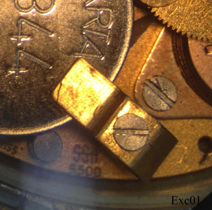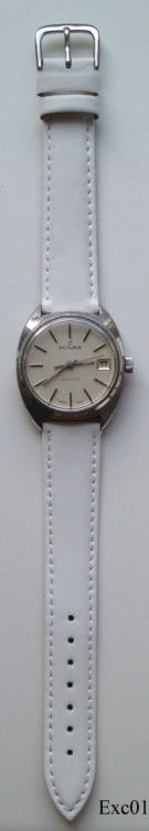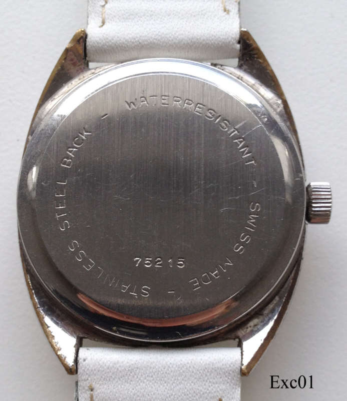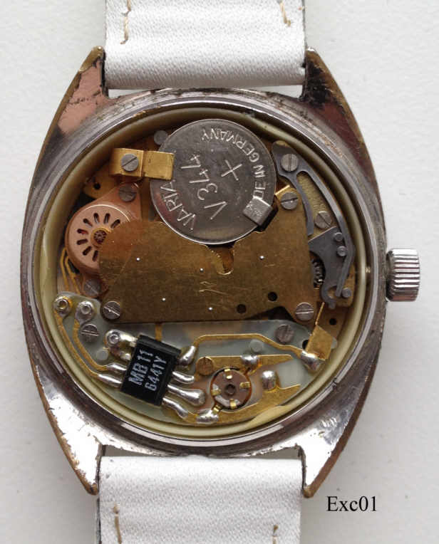 An Excalibur Quartz watch, one of the early analogue quartz watches. SSiH movement Caliber 5500, date at 3. Signed front: “Excalibur, Quartz, Swiss Made”, back: “Stainless Steel Back, Water Resistant, Swiss Made, 75215”, inside: “SSiH 5500, Unadjusted, Three 3 Jewels”. White Leather band.