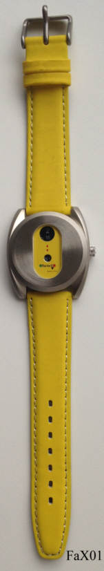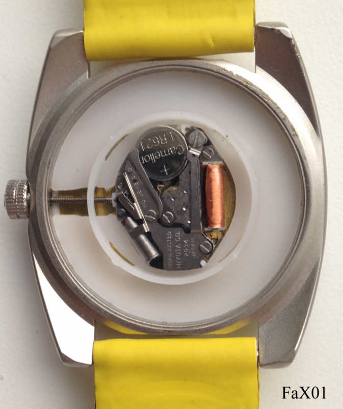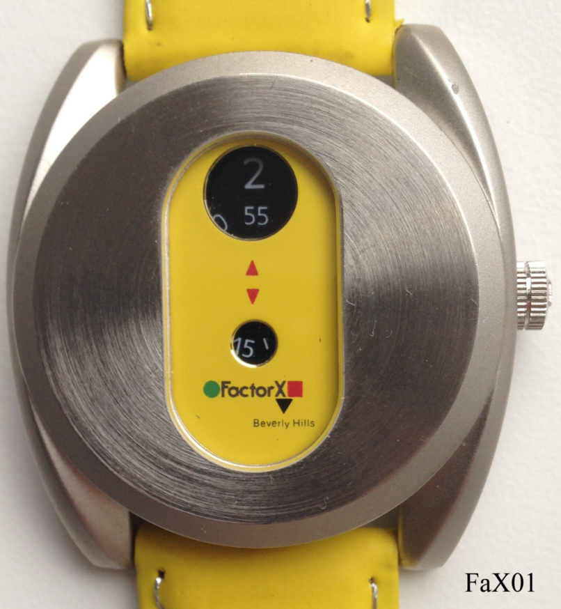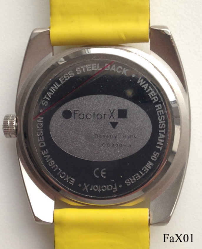 Dies ist eine “Retro” FactorX Digital Quartzuhr. Sie hat ein normales Quartzwerk, statt der Zeiger drehen sich aber drei Scheiben: Stunden-, Minuten- und Sekundenscheibe. Die Uhrzeit wird dann in den beiden runden Fenstern abgelesen. Hier wurde ein massives Edelstahl Gehäuse verwendet. Beschriftet vorn:” FactorX, Beverly Hills”, hinten:”Stainless Steel back, Water Resistant 50 Meters, FactorX, Exclusive Design, FactorX, Beverly Hills, CC200-5”. Das Werk ist ein Miyota 2034.