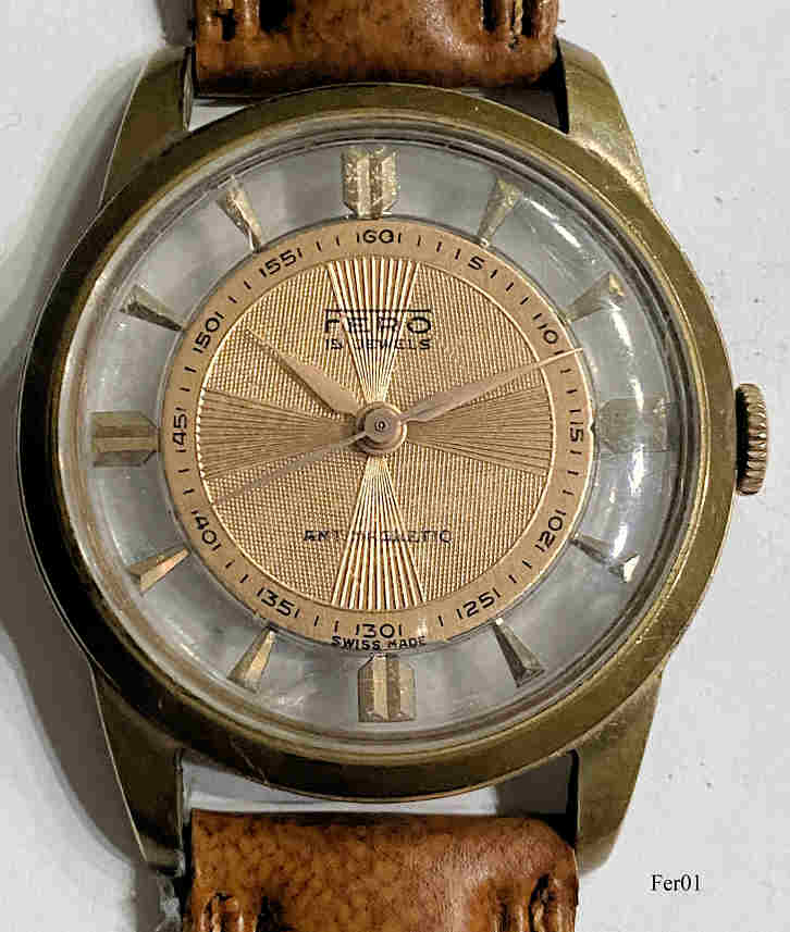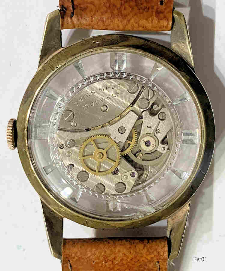 A handwind skeleton watch of Fero from China. The case is made of base metal. Signed front: “Fero, 15 Jewels, Antimagnetic”, back: “Swiss Made, 15 Jewels”. Bar Numbers, brown plastic band