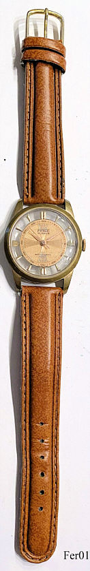 Eine Handaufzugs Skelettuhr der Marke Fero aus China. Das Gehäuse ist aus Base Metal. Beschriftung vorn: “Fero, 15 Jewels, Antimagnetic”, hinten: “Swiss Made, 15 Jewels”. Balken Ziffern, braunes Kunstlederarmband