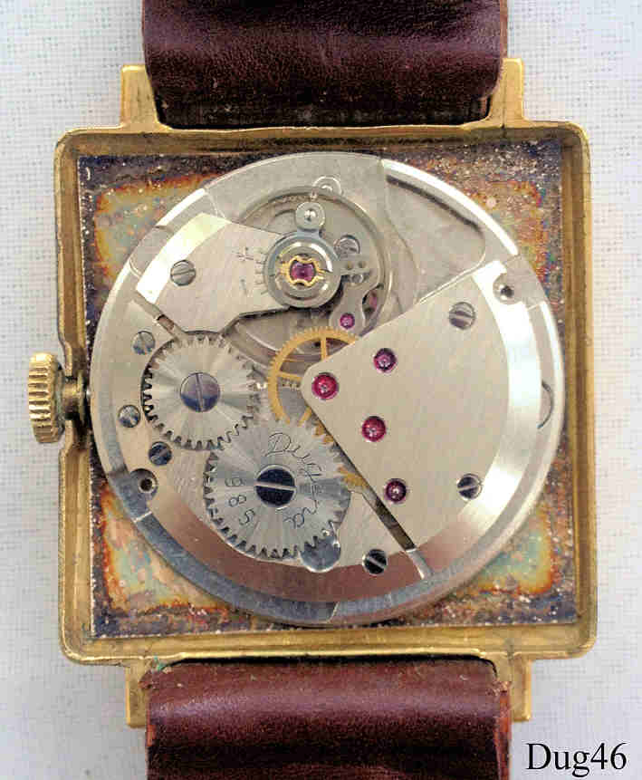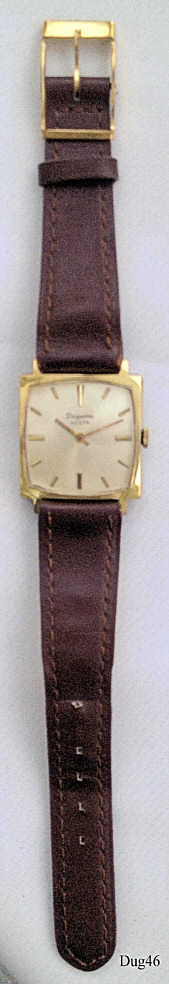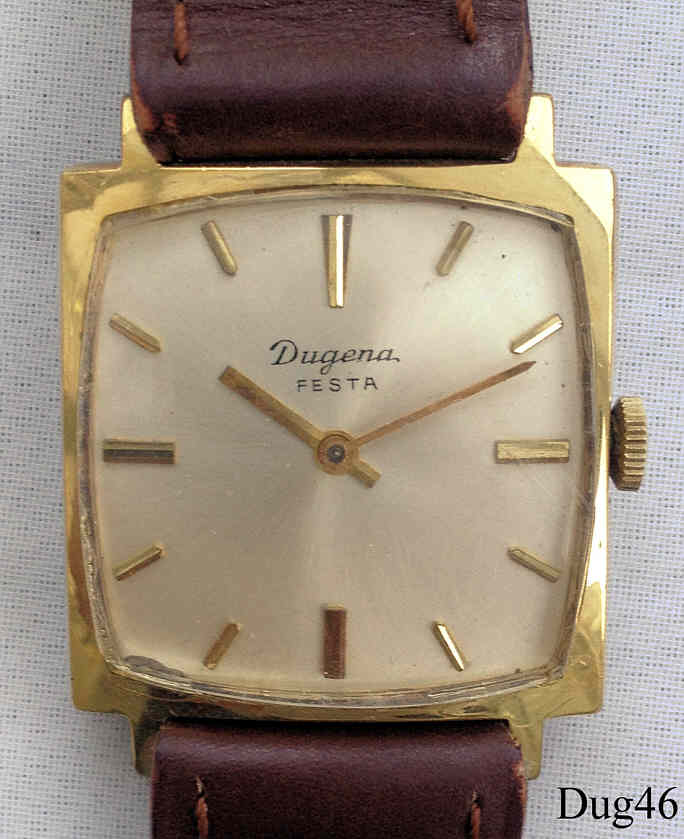 A Dugena Festa handwind watch with gold plated case and stainless back. Caliber Dugena 985, Signed front: “ Dugena, Festa” back: ”Edelstahl-Boden, DUGENA”, inside: ”Dugena, 985”. Brown leather band with neutral clasp.