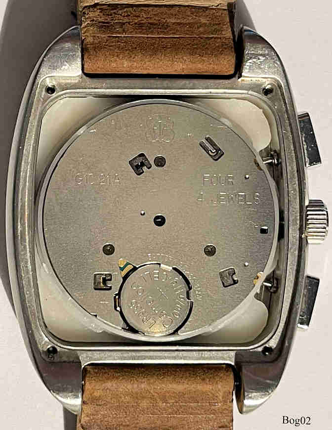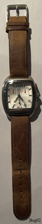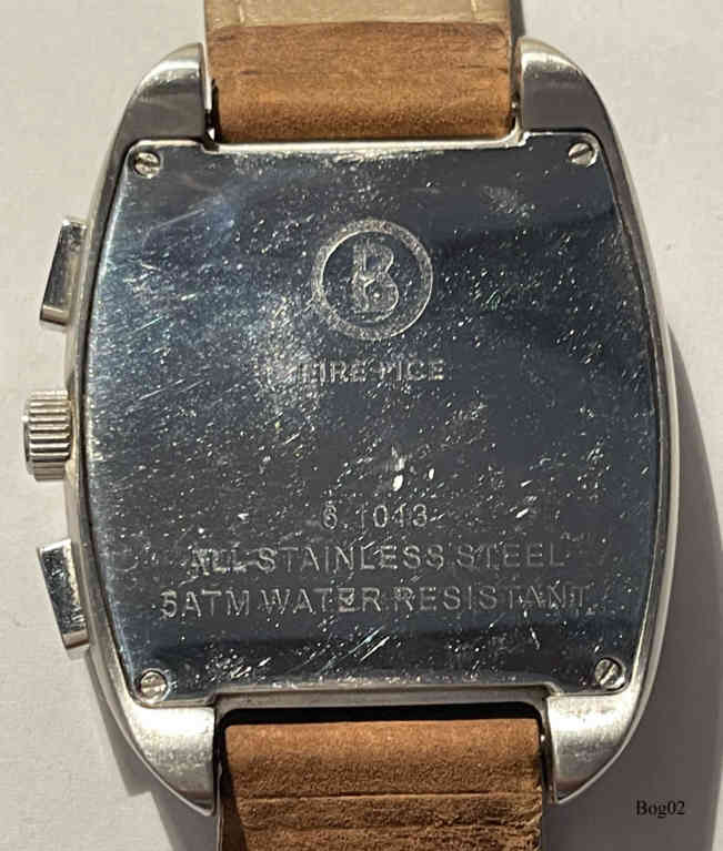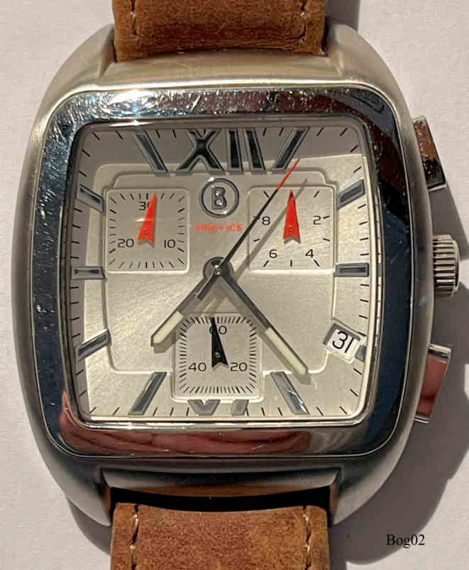 Dies ist ein Bogner Fire & Ice Chronograph. Er hat ein braunes Lederarmband und arbeitet mit einem ETA G105.21A Werk. Silbernes Zifferblatt mit dem Datum bei der 4. Beschriftet vorn: “B, Fire + Ice, Made in Germany” hinten: ”B, Fire&Ice, 6.1043, All Stainless Steel, 5 ATM Water Resistant”, innen:”ETA, Swiss V8, Four 4 Jewels, G10.21A, Battery 394”.