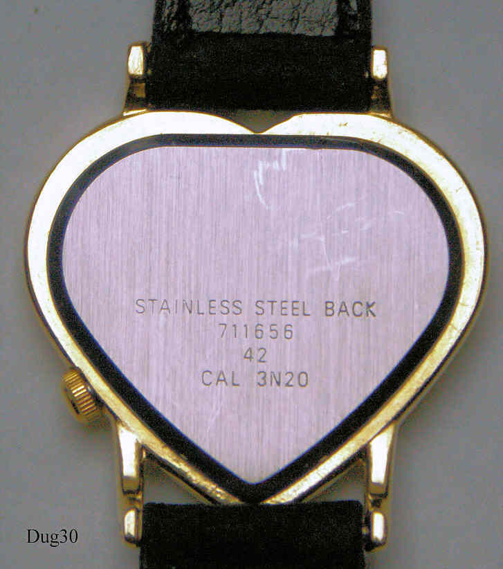 A Dugena Flair Ladies Quartz watch with heart shaped case, zirkonia applications and Stainless Steel Back. Signed front: “ Dugena, Flair” back:” Stainless Steel Back, 711656, 42”, inside:”Miyota Co., One 1 Jewel, Japan, Unadjusted, 3N20”. Black Band with velvet look.