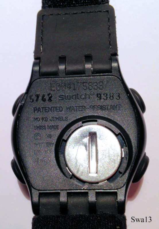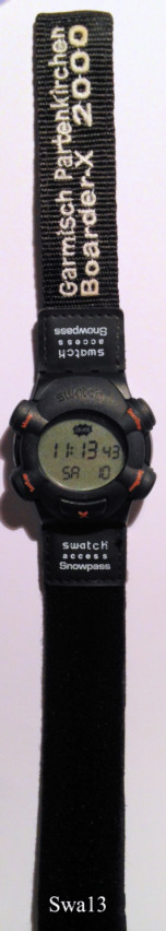 Eine Swatch Access LCD Digitaluhr, Modell “Garmisch Boarder X 2000” SXB100F, aus der Frühjahr/Sommer Kollektion 1999 mit Kunststoff Gehäuse. Beschriftet hinten: “E004175633, 5742, Swatch, 9383, Patented, Water Resistant, No (0) Jewels, Swiss made, V8, Battery CR1632, 16x3,2”, Kunststoff Armband mit Klettverschluß. Diese Uhr hat einen integrierten Microprozessor, der induktiv mit Daten geladen werden kann. Damit dient die Uhr als Zugangskontrolle in fast allen bekannten Skigebieten. Man hält nur die Uhr, nachdem sie am Ticketschalter geladen wurde, an den Zugangsautomaten und schon wird die Schranke geöffnet.