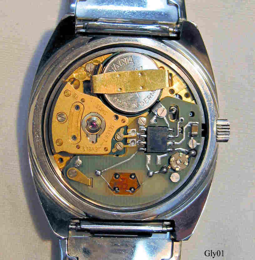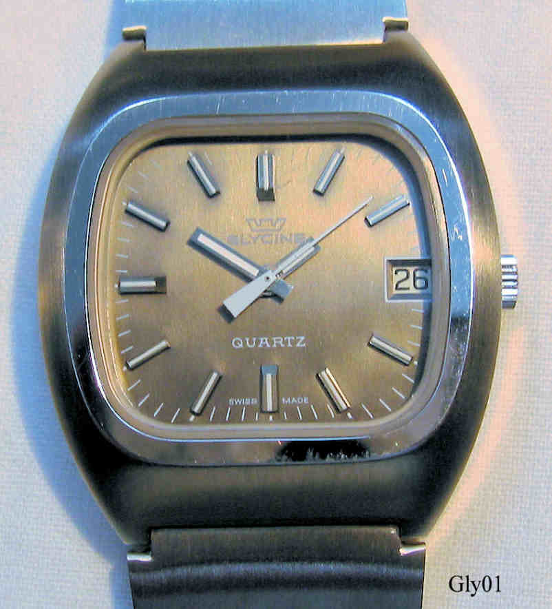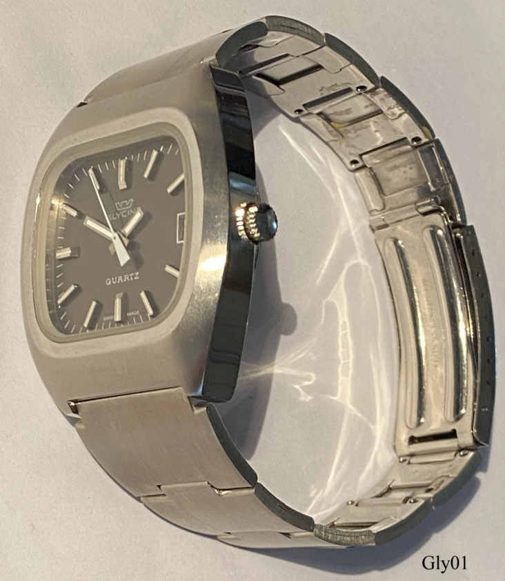 A Glycine Quartz, one of the early analogue quartz watches. ETA movement Caliber 9182, date at 3. Signed front: “Glycine, Quartz, Swiss Made”, back: “Waterproof, 4 ATÜ, RF, Discu Safe, All Steel”, inside: “Seven 7 Jewels, Swiss, Y2, ETA 9182”. Stainless Steel band.