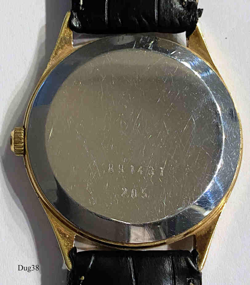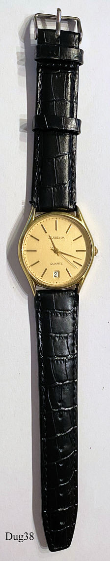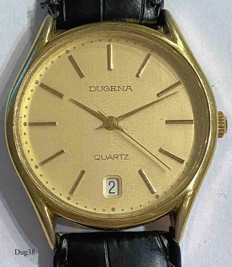 A Dugena mens Quartzwatch with gold plated case and Stainless Steel Back. Caliber ETA 944.111. Signed front: “Dugena, Quartz” back: ”891431, 205”, inside: ”944.111, seven 7 Jewels, Unadjusted”.