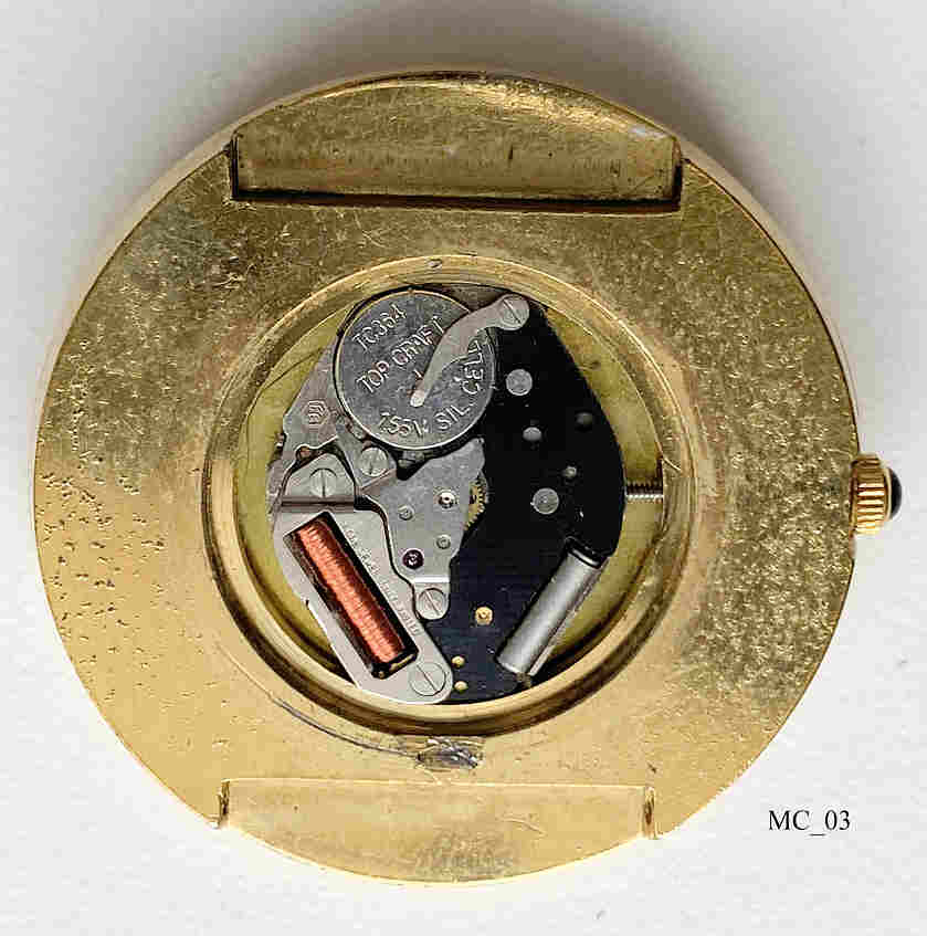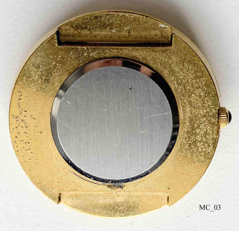 A very nicequartz watch with metal covered dial of brand MC. In the outer ring the hours are noted, in the inner ring the minutes. Signed front: “MC, Quartz”, inside: ”Unadjusted, FE, 6120-30, 1 One Jewel”, back: “ ”.