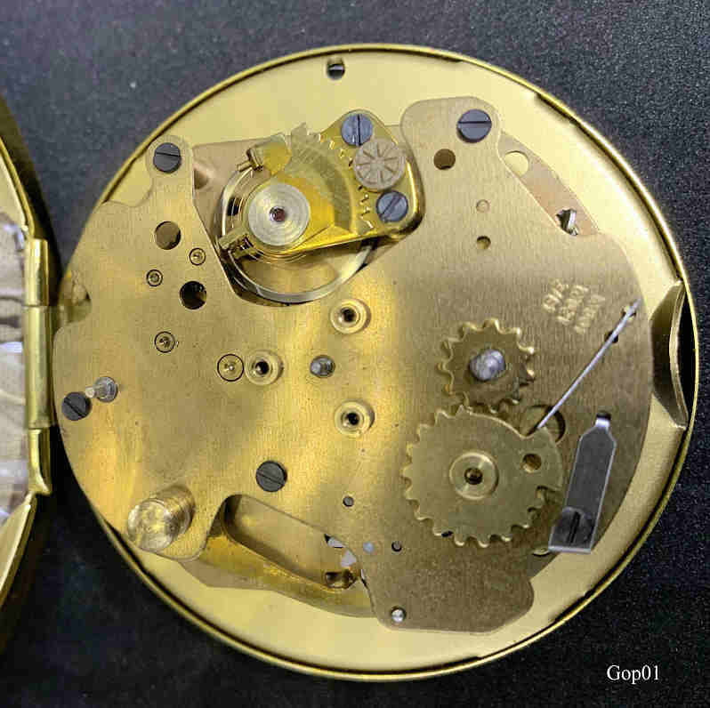 Dies ist ein Reisewecker der Firma Goldpfeil mit dem Markentypischen roten Leder. Beschriftet vorn: ”Pfeillogo, Sport, Germany”, hinten: ”Alarm, Germany”, innen: “W001, W021, 3/91”.