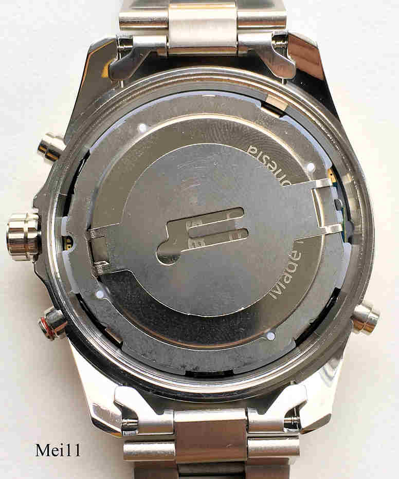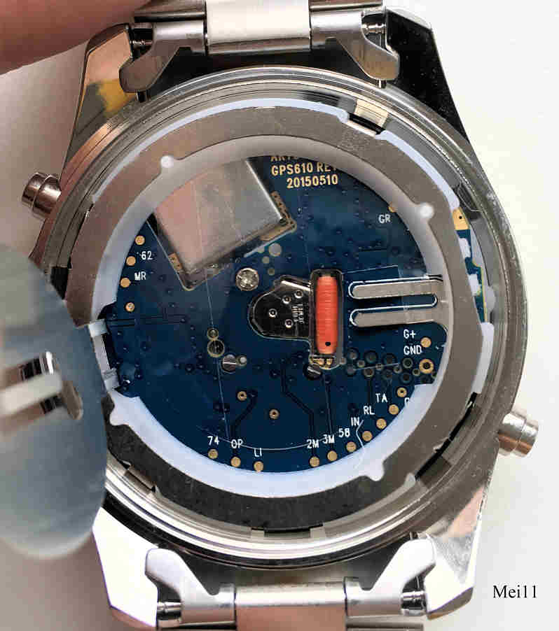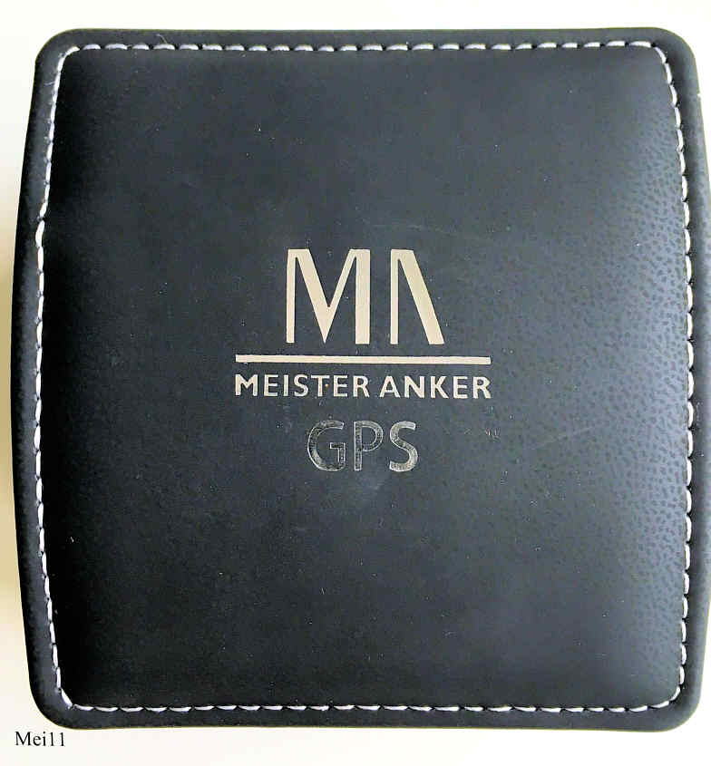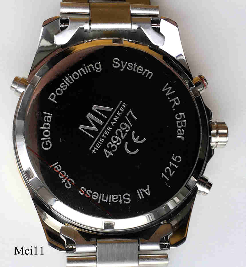 Eine große GPS Uhr der Handelsmarke Meister-Anker mit Quartzwerk. Das Gehäuse ist aus Edelstahl mit einem Goldfarbenen Ring, beschriftet mit den Namen der Voreingestellten Städte der Welt. Der Knopf oberhalb der Krone zeigt die Empfangskontrolle und den Breitengrad, der Knopf unterhalb zeigt die Weltzeitzone und das Datum. Der Knopf links unten dient der manuellen Einstellung der Zeitzone und die Beleuchtung. Die Uhr zeigt automatisch die Uhrzeit der jeweiligen Position an, gesteuert über das GPS System. Beschriftet vorn: “MA, Meister Anker, GPS, Long Life”, hinten: “Global Positioning System, W.R. 5 Bar, 1215, All Stainless Steel, Meister Anker, 43929/7 CE”, innen: “Artstate, GPS 610, 20150510”, Stahl Gliederarmband.