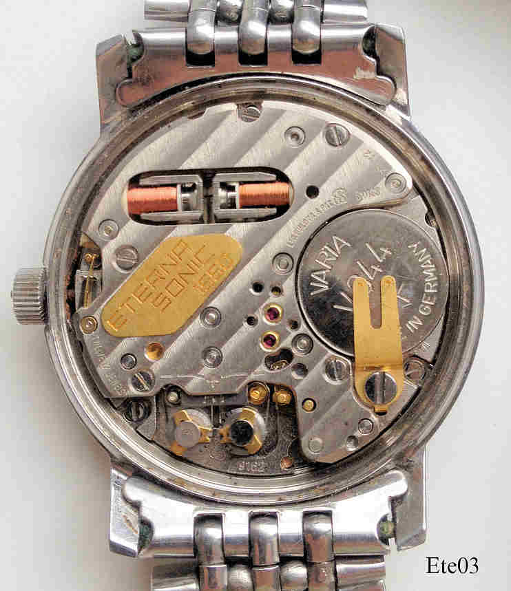 This is an Eterna Sonic with Stainless Steel case in a very slim design, date at 3. The movement is an Eterna 1550 (ETA 9162), signed front: ”ETERNA, Sonic, Electronic”, back: ”Water Resistant, 5788136”, inside: ”ETERNA WATCH Co, 1550, Unadjusted, 12 Jewels”. The watch has a stainless steel band.