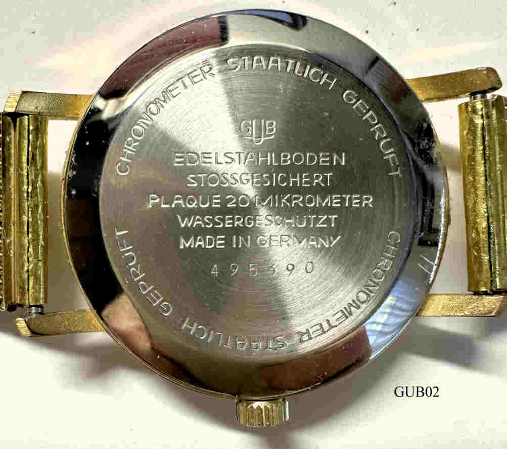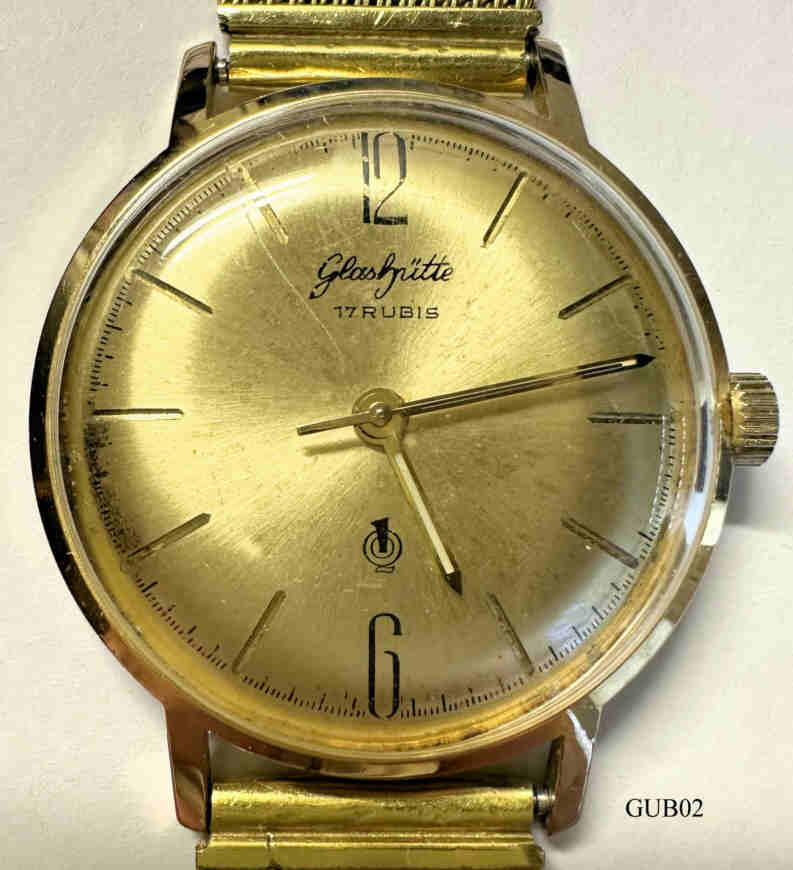Ein Chronometer der Firma Glashütte Original aus DDR Produktion. Beschriftung: ”€Glashütte, 17 Rubis, Made in GDR”€ hinten: ”GUB, Edelstahlboden, Stoßgesichert, Plaque 20 Mikrometer, Wasser Geschützt, Made in Germany, 495390, Chronometer Staatlich geprüft”€, innen: ”GUB, 70.3”€. Vergoldetes Mesch Armband. Diese Chronometer wurden auch über Westdeutsche Versandhäuser, z.B. Quelle, vertrieben.