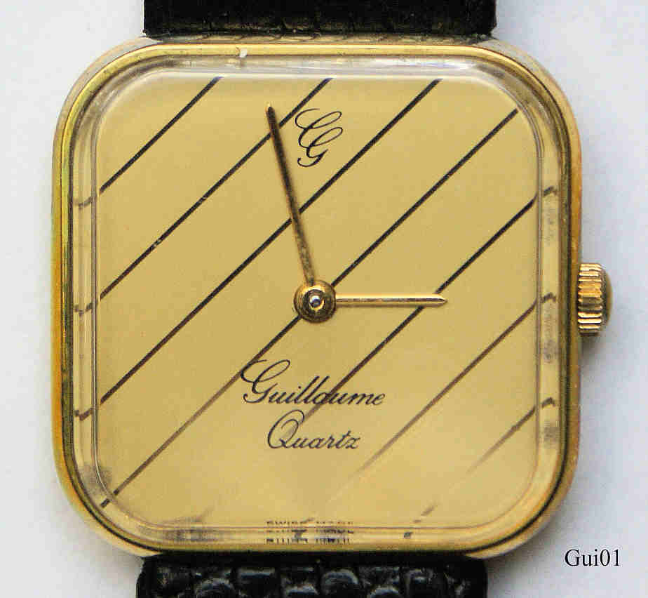 A Designwatch of Guillaume. It has a black leather band. Signed front: “Guillaume, Quartz, Swiss Made”, back: “ ”, inside: “Harley, 672, 5 Five Jewels, unadjusted”. Caliber Harley 672.