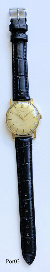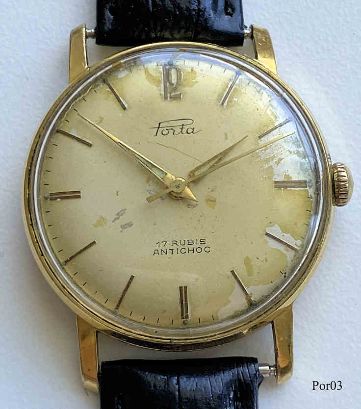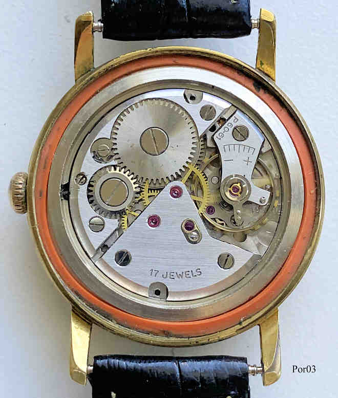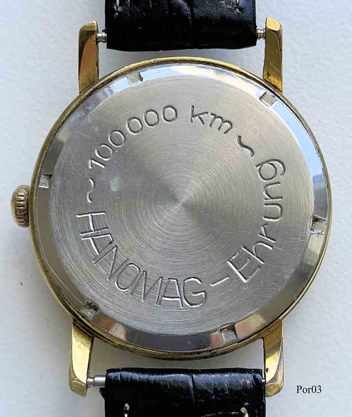 Ein Handaufzugsuhr der Firma Porta mit goldfarbenem Zifferblatt, vergoldetem Gehäuse und verschraubtem Edelstahl Rückdeckel. Beschriftet vorn: “Porta, 17 Rubies, Antichoc”, hinten: ”Hanomag-Ehrung, 100000 km”, innen: “17 Jewels, PUW 60, 61”, Werk Caliber PUW 60. Diese Uhr wurde von Hanomag für 100.000 Km mit einem Hanomag LKW vergeben.