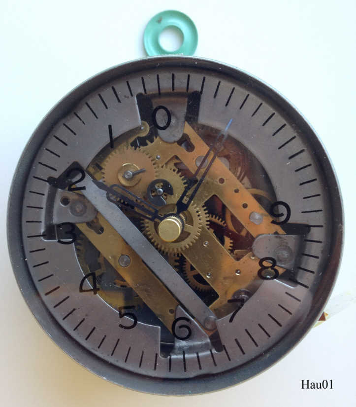 A slightly modified Alarmclock to be used for desinformation during war times. The clock is tied to a gas baloon with the green hole and the package with the relevant material is hung from the L shaped bar in the back of the clock. When the adjusted flight time is over the bar is disengaged and the packet is falling down in the calculated area. The clock is manufactured on behalf of the german Bundeswehr at Gebr. Hauser in Villingen Schwenningen around 1960. |