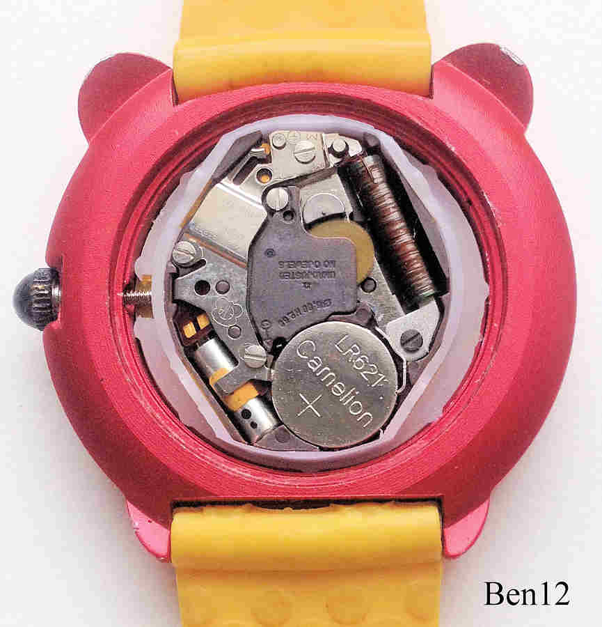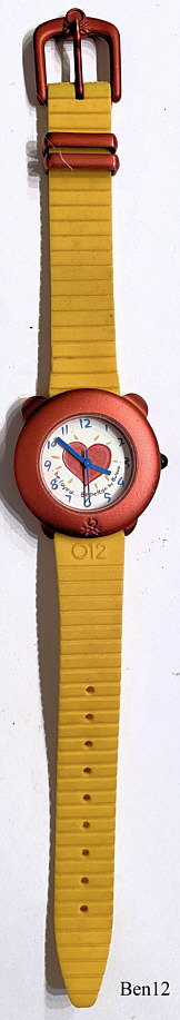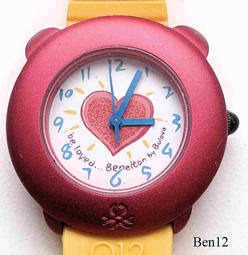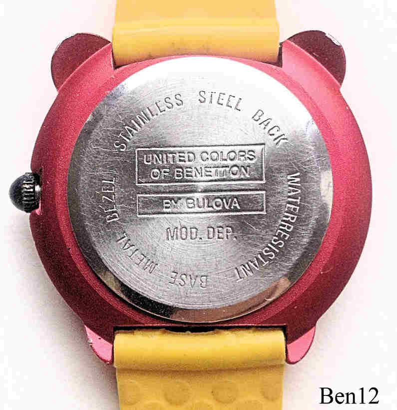 Benetton by Bulova, signed front: ”Be Loved - Benetton by Bulova”, back: ”United Colors of Benetton by Bulova, Stainless Steel Back, Water Resistant, Base Metal Bezel, Mod. Dep.”, inside: ”Swiss parts, one Jewel, Assy in Thailand”, yellow plastic strap with Benetton clasp.
