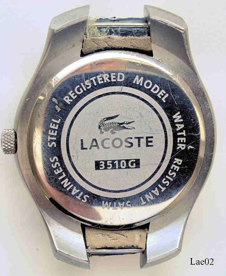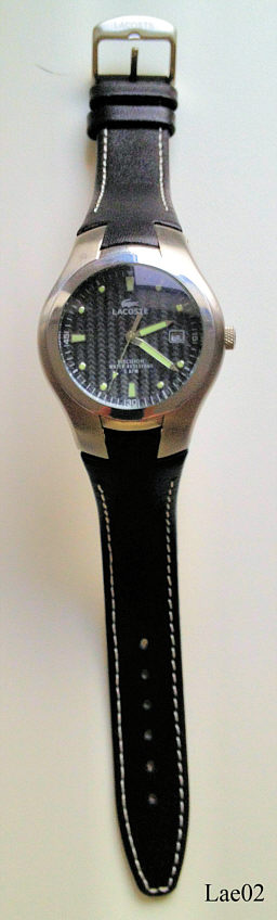 Dies ist eine Herrenuhr von Lacoste mit schwarzem Carbon Zifferblatt. Beschriftet vorn: ”Lacoste, Precision, WaterResistant, 5 ATM”, hinten:” Stainless Steel, Registered Model, Water Resistant 5 ATM , Lacoste, 3510G”, innen: “6M12, Miyota, unadjusted, No Jewels”.