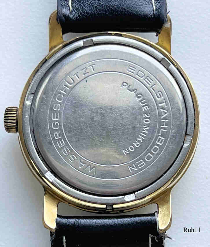Eine Ruhla Handaufzugs Herrenuhr mit vergoldetem Gehäuse und Stainless Steel Back, eine Uhr aus der Ruhla UMF Manufaktur. Beschriftung vorn: ”€œUMF, Ruhla, 15 Rubis, Antimagnetic” hinten: ”Wassergeschützt, Plaque 20 Micron, Edelstahlboden”, innen: ”€œE490 “€. Uhrwerk UMF E490, Schwarzes Leder Band