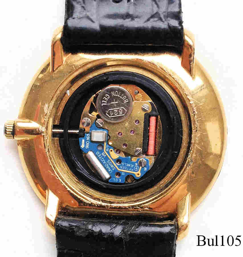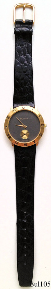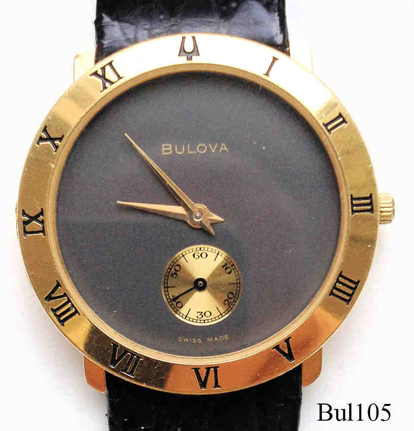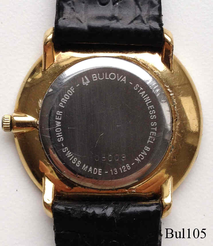 Eine recht moderne Quartzuhr von Bulova mit einem sehr schlichten, schwarzen Zifferblatt, Sekundenskala in Gold bei der 6, römische Ziffern auf dem Goldrand. Beschriftet vorn: “BULOVA, Swiss Made”, hinten: “Swiss Made, 13128, Stainless Steel Back, Shower Proof, Bulova, 08003”, innen: ”980.163, Unadjusted, Swiss V8, Fifteen Jewels”, kein Herstelldatum, schwarzes Lederarmband.