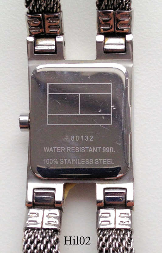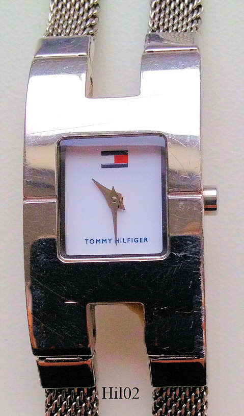 Eine Designuhr der Modefirma Tommy Hilfiger. Die Uhr hat die Form des H von Hilfiger und ein geteiltes Edelstahl Milanaise Armband. Beschriftung vorn: “Tommy Hilfiger”, hinten: “F80132, Water resistant 3 ATM, 100% Stainless Steel”, innen: “Ronda, one 1 Jewel, Swiss Parts, Thailand Made, 762”. Kaliber Ronda 762.