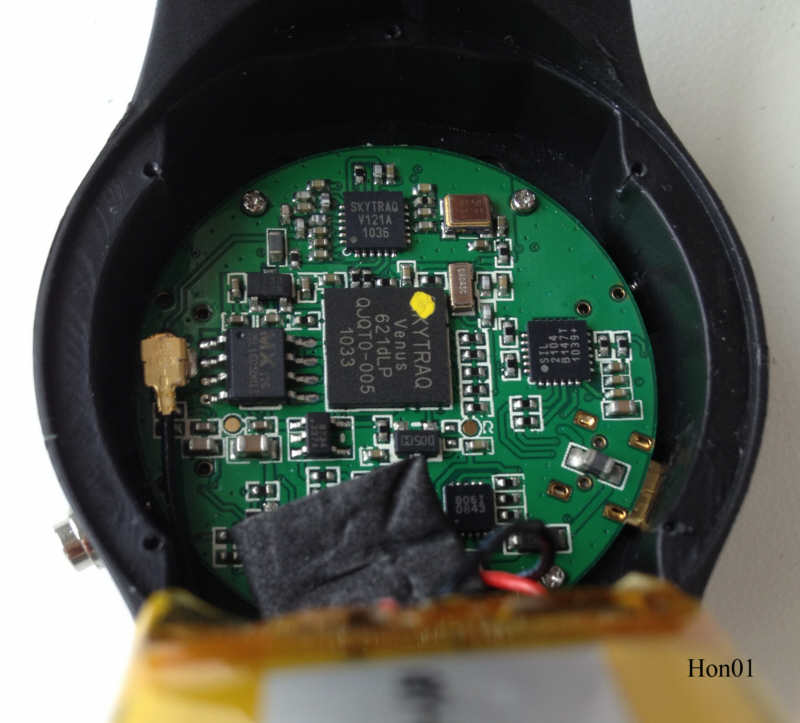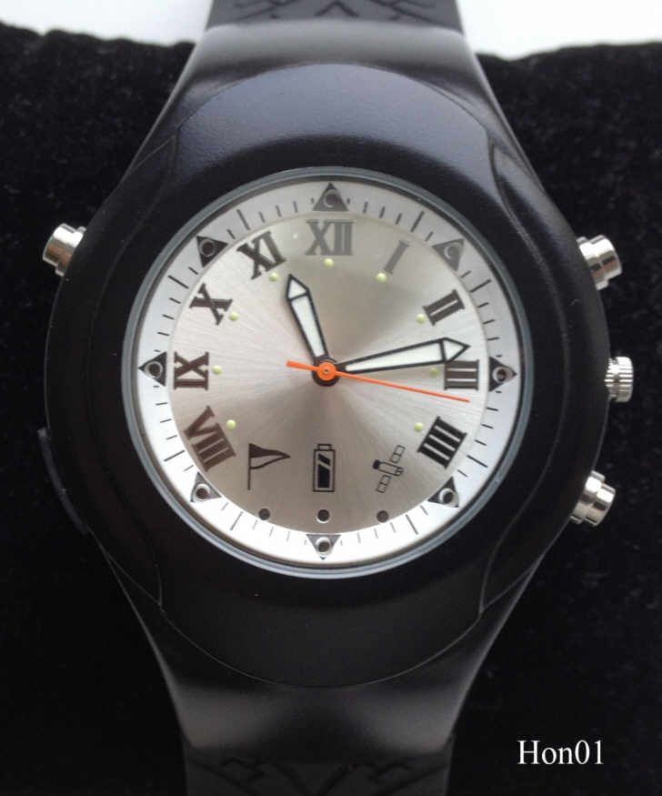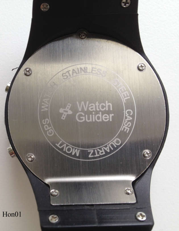 Eine GPS Uhr aus Fernost, bestehend aus zwei Haupt-Funktionsteilen: Eine normale Quartz Armbanduhr mit einem Seiko Werk und einem GPS Empfänger mit DataLogger und POI Funktion. Das Zifferblatt hat 8 Direktions LEDs sowie 3 Funktions LEDs. Die Direktions LEDs sitzen in den Dreiecken am äußeren Rand und zeigen die (Himmels-) Richtung zum Ziel an. Die drei Funktions LEDs zeigen: Rechts den Satelliten Empfang, Mitte Akku Zustand, Links Entfernung zum Ziel. Beschriftet vorn: “”, hinten:”GPS Watch, Stainless Steel Case, Quartz Movt, Watch Guider”, SkyTraq Venus6 chipset mit 65Kanal Sat Erkennung. Speichert bis zu 100.000 Wegpunkte.