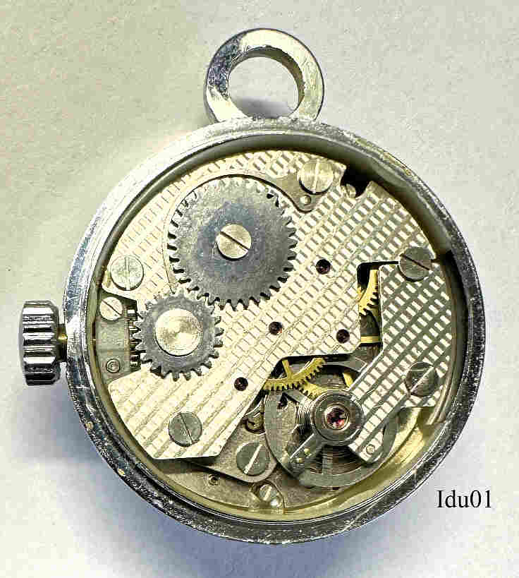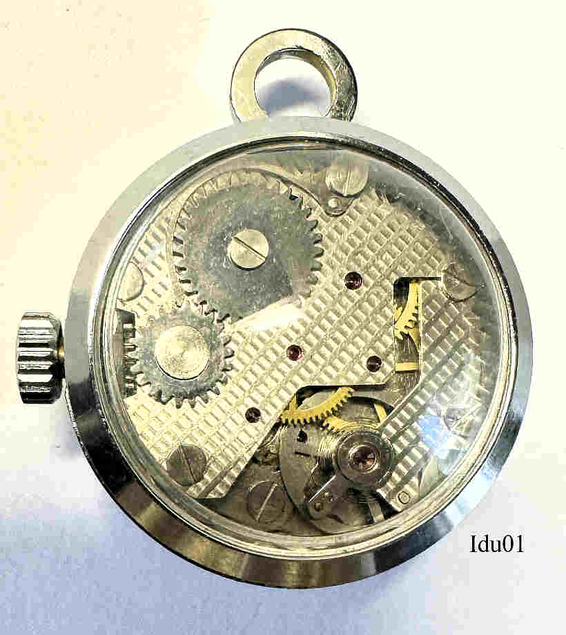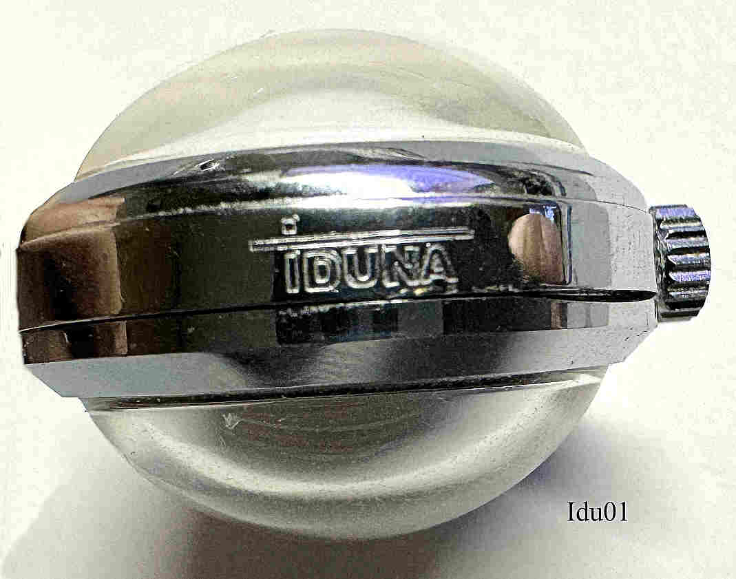 Eine Handaufzugs Werbe-Kugeluhr als Kettenuhr, Kaliber CRC 960/21. Hergestellt in Frankreich bei der ”Montres Esperanto”, eine Tochterfirma der Cupillard-Vuez & Rieme. Beschriftet vorn:”Eperanto, 15 Rubis”, innen: ”CRC960” . Gehäuse Base Metall, Zifferblatt mit 8 Stegen und 4 arabischen Ziffern. Auf dem Ring eingeprägt “Iduna” .