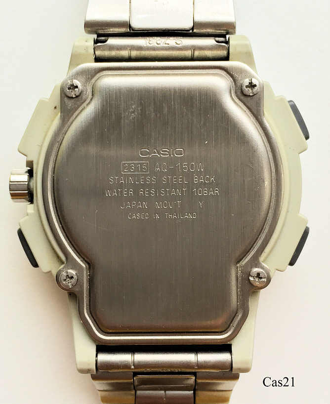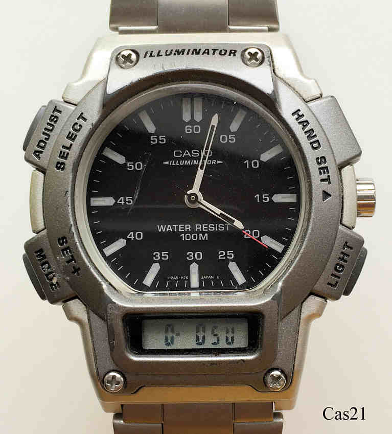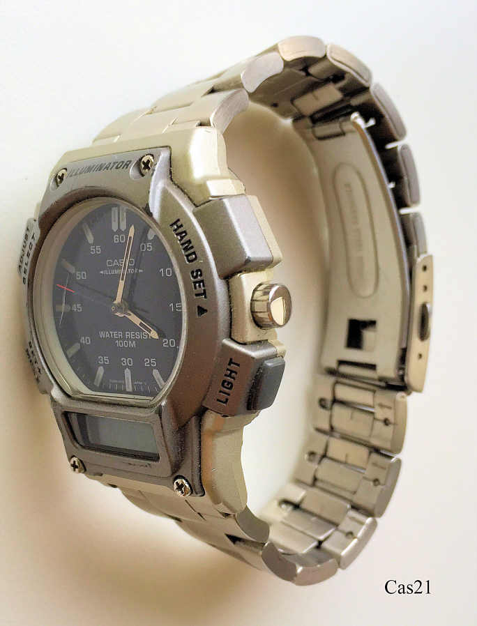 Ein moderner Ana/Digi Chronograph von Casio. Kunststoff Gehäuse mit Edelstahl Gliederarmband, schwarzes Zifferblatt, Digitalanzeige unter der 6. Beschriftet vorn: ”Casio, Illuminator,Water Resistant 100m”, innen: ”Casio, China”, hinten: ”Casio, 2315 AQ 150W, Stainless Steel Back, Water Resistant 10 Bar, Japan Mov’t Y, Cased in Thailand”.