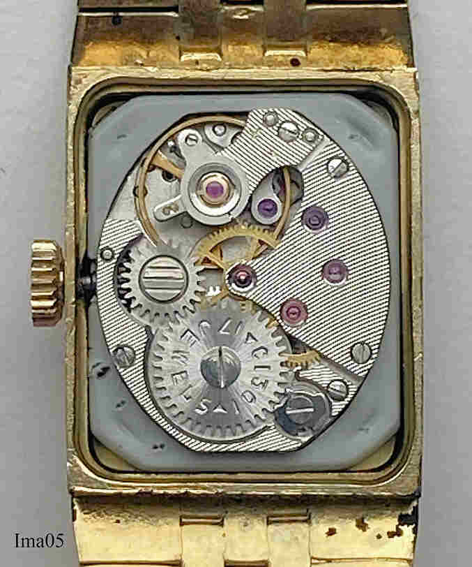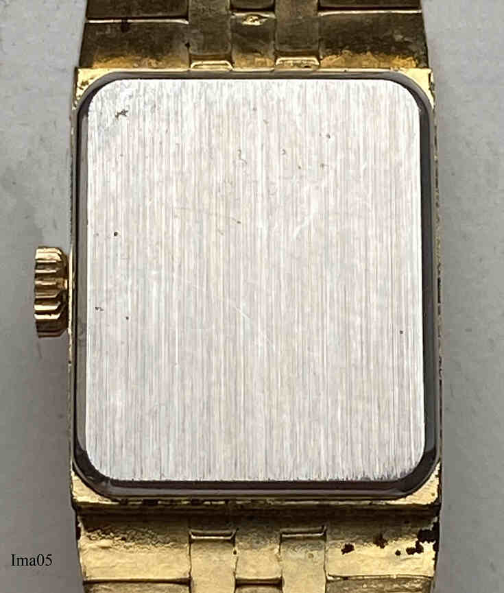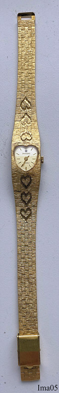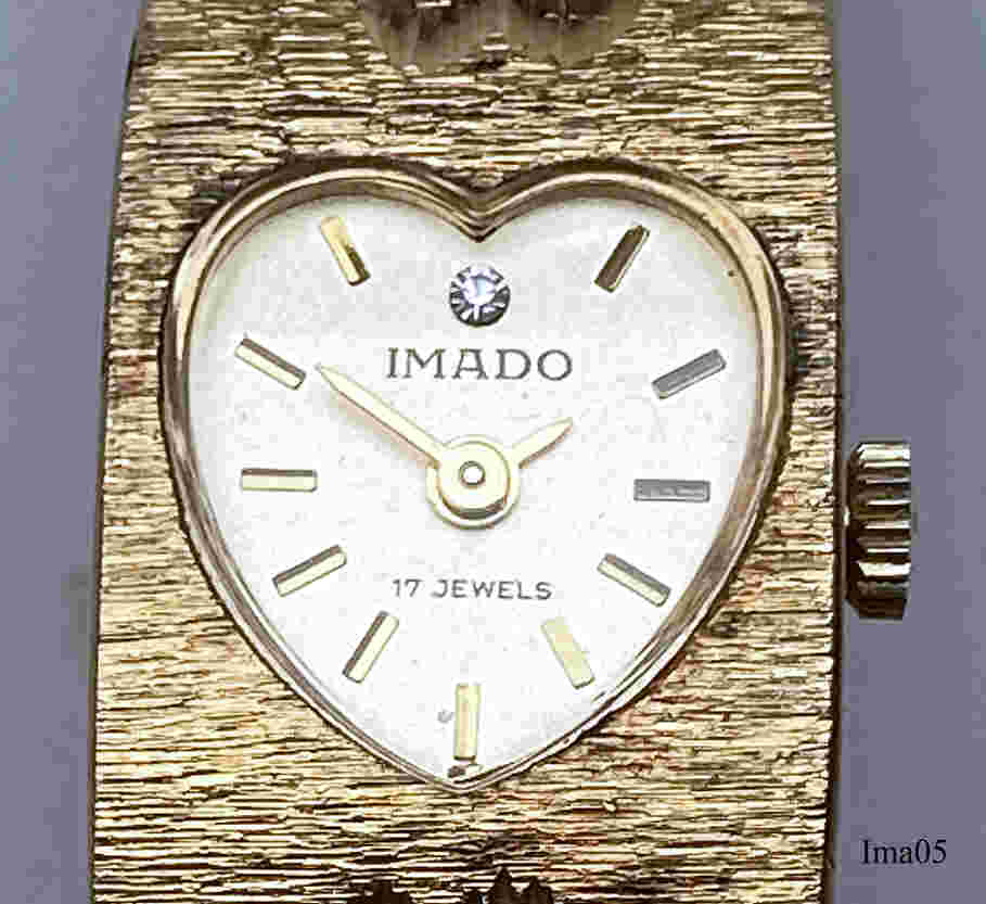 Diese herzförmige Imado Armbanduhr hat ein wunderschönes Gehäuse in einem Gliederarmband integriert. Im Zifferblatt ist die 12 durch einen Brillantsplitter markiert. Die Uhr hat 17 Steine. Inschrift: “Imado, 17 Jewels”. Das Werk ist ein Kaliber Chaika 1301.