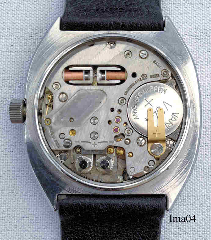 Dies ist eine Imado Stimmgabeluhr, ESA 9162, Edelstahl Gehäuse, Kalender bei der 3. Bezeichnung auf dem Zifferblatt: ”Imado, Electronic, Swiss Made”, In der Rückwand: ”Imado, All Stainless Steel, Water Resistant, 962 005 30”, innen: “Twelve 12 Jewels, Lic. Bulova & Pat. ETA Swiss”..