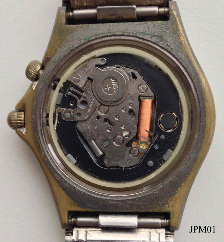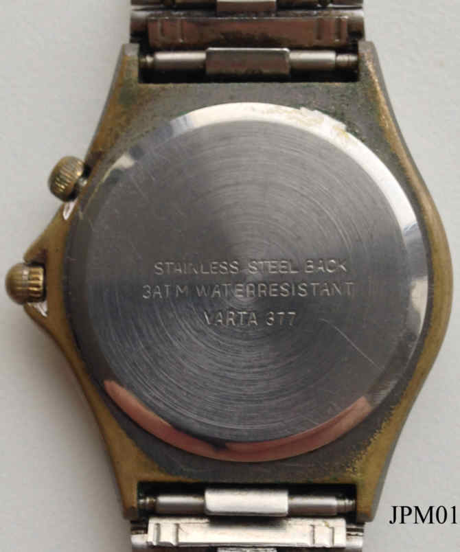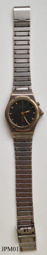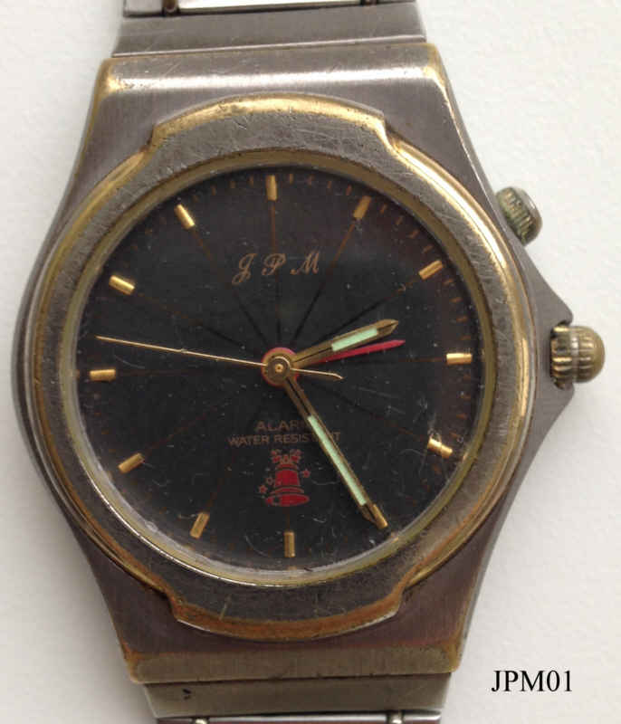 Ein Armbandwecker der Marke J.P.M.. Der rote Zeiger zeigt die Weckzeit und wird über die Krone bei 2 eingestellt. Beschriftet vorn: ”J.P.M., Alarm, Water Resistant”, hinten: ”Stainless Steel Back, 3 ATMWater Resistant,Varta 377”, innen: “Miyota Co., Japan 6L7 Unadjusted, No 0 Jewels”. Base Metal Gehäuse mit Edelstahl Armband.