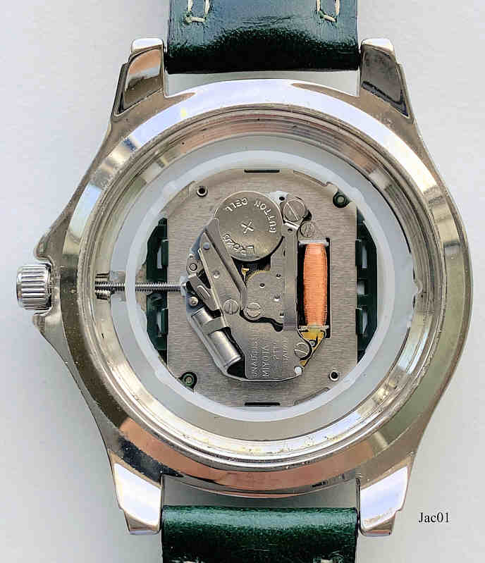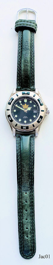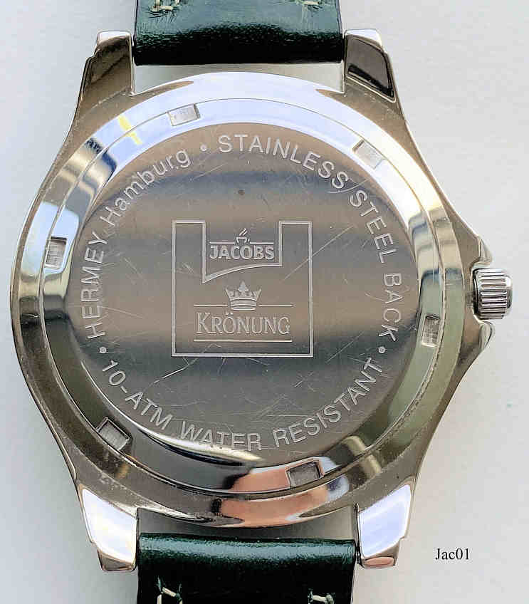 Eine Werbeuhr des Kaffeerösters Jacobs für seine Sorte Krönung. Es handelt sich um eine einfache Quartzuhr mit Datum. Beschriftet vorn: ”Wappen, 10 ATM, Quartz”, hinten: ”Hermey Hamburg, Stainless Steel Back, 10 ATM Water Resistant, Jacobs, Krönung”, innen: “Unadjusted, Miyota Co., 2115, Japan”. Grünes Lederarmband mit Krokonarbung.