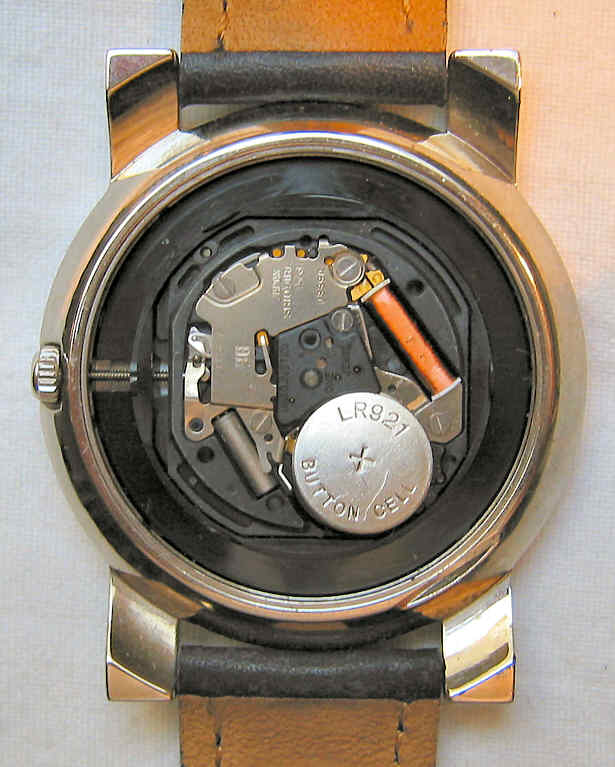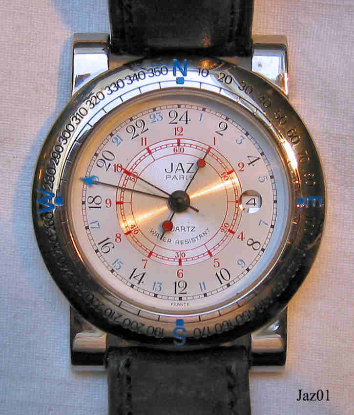 Dies ist eine Jaz Quartzuhr, sie verwendet ein Quartz Werk von Shiojiri. Beschriftet vorn: ”Jaz, Paris, Quartz, Water Resistant”, hinten: “Jaz, Paris, ZMYZ7BP, Assembled in France, Water Resistant, Base Metal Bezel,Movt. Japan, Stainless Steel Back”, innen: ”98, Japan, Shiojuri Ltd., V339A, Unadjusted, one Jewel”. Die Uhr hat ein ansprechendes Gehäuse mit Kompaßeinteilung auf dem Außenring. Das Zifferblatt hat im Innenring eine 12 Stunden Einteilung in rot und im Außenring eine 24 Stunden Einteilung in Schwarz mit einem GMT Zeiger mit blauer Spitze. Datum bei der 3, schwarzes Lederarmband.
