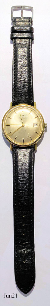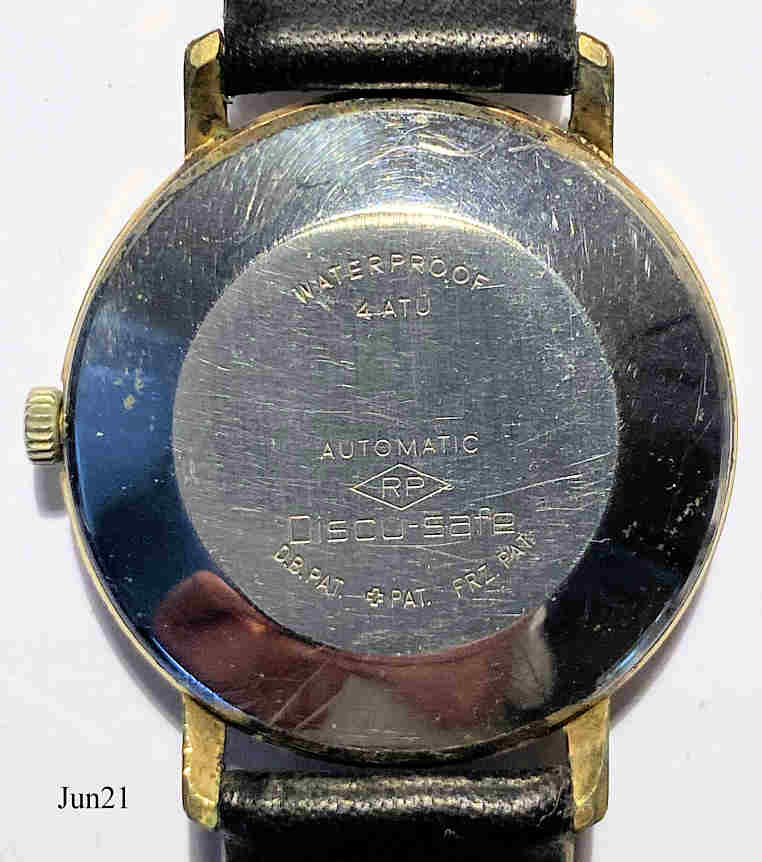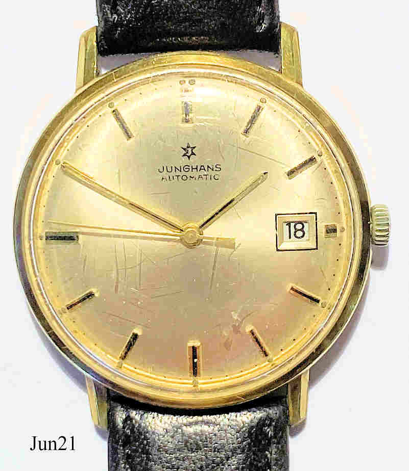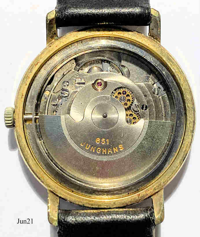 Dies ist eine vergoldete Junghans Automatic, mein Hochzeitsgeschenk von meiner Frau, d.h. gekauft 1968. Beschriftet vorn: ”Junghans Automatic”, hinten: ”Waterproof 4 ATÜ, Automatic, RP, Discu-Safe, D.B.Pat., + Pat., Frz. Pat”., innen: “651, Junghans, ETA 2472”. Datum bei der “3”. Kaliber J651, ETA 2472.