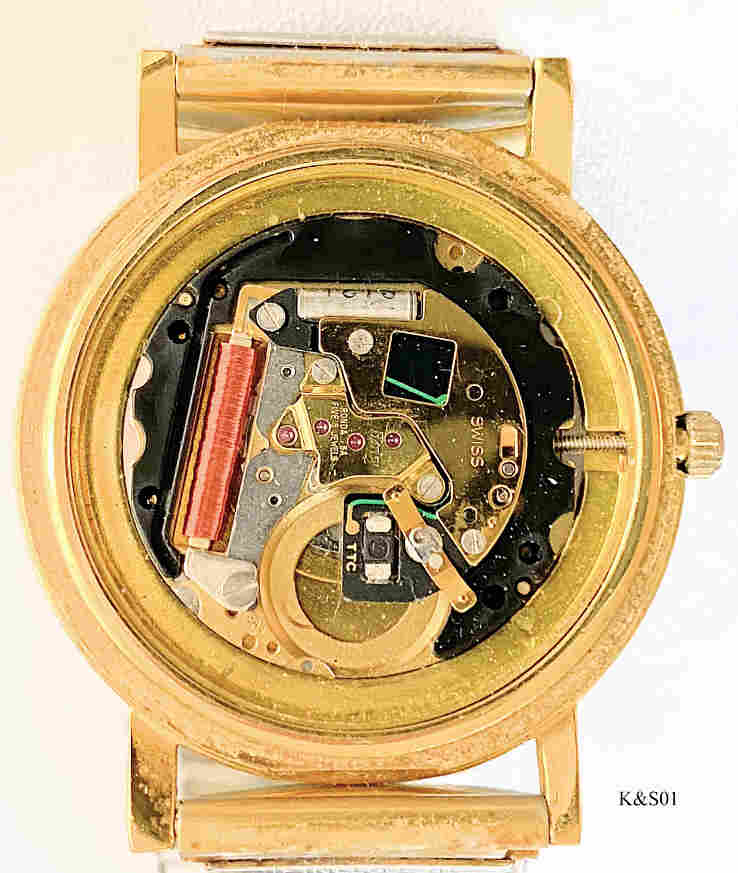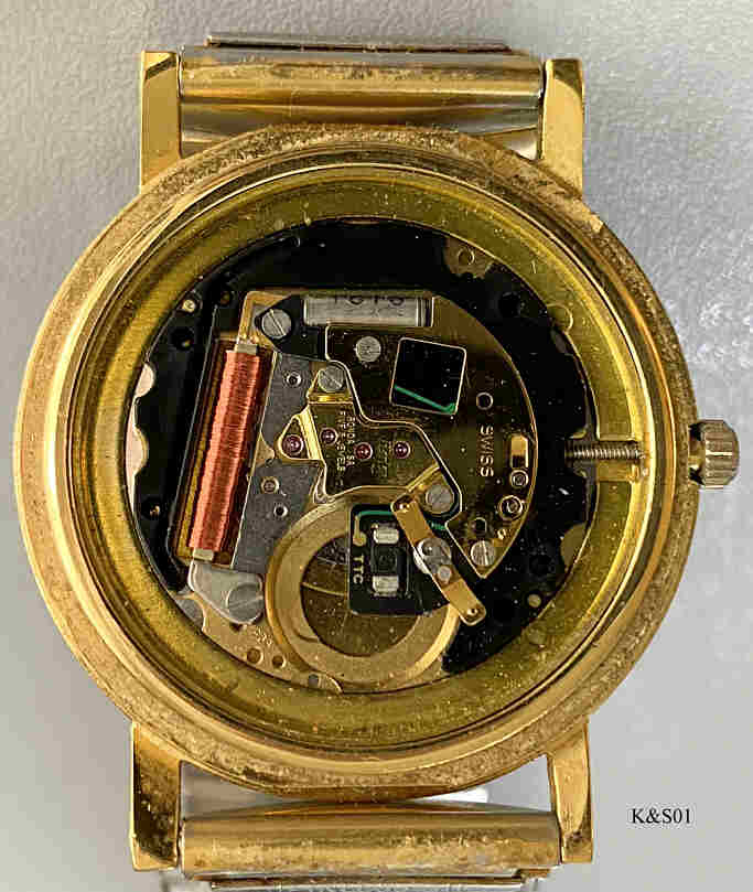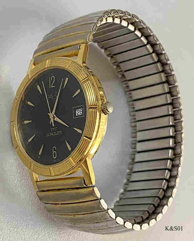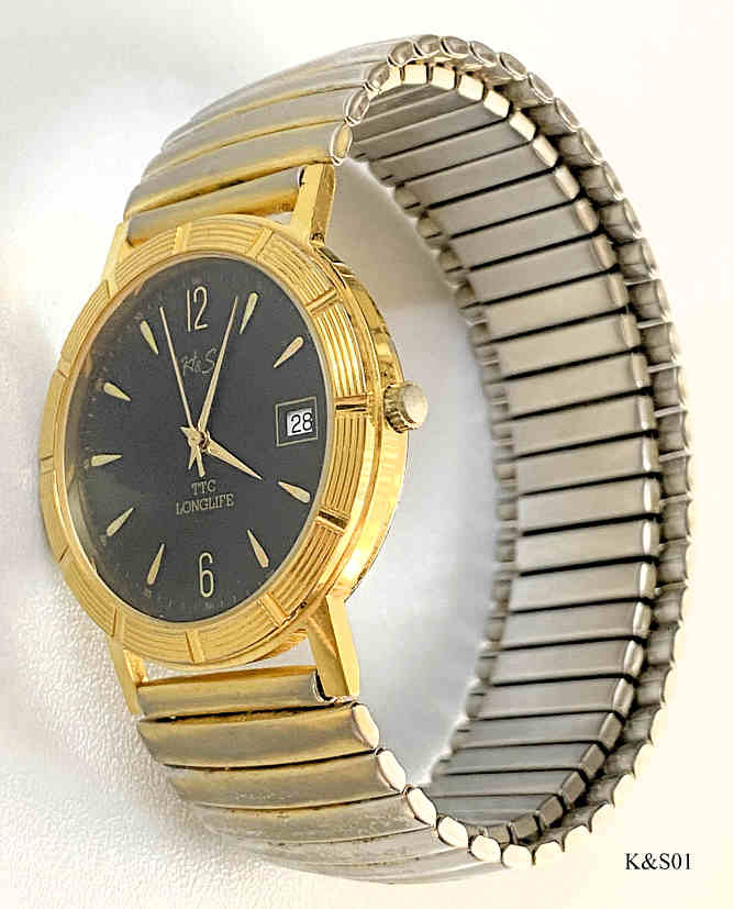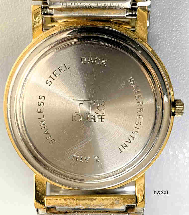 Eine K&S Uhr (Kronen&Söhne) mit schönem, schwarzem Zifferblatt, Datum bei der 3. Beschriftet vorn: “K&S, TTC, Longlife”, hinten: “Stainless Steel Back, Water Resistant 3 ATM, TTC Longlife”, innen: “Swiss, Ronda, Five 5 Jewels, GBA”. Longlife bezieht sich auf die Batterie, auf die die Firma ISECO 20 Jahre Garantie gibt. Die ganze Rückwand ist die Batterie. Leider überstand ISECO die Garantiezeit nicht......Die Firma Junghans übernahm die Garantie, allerdings........