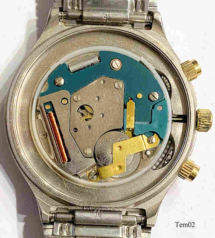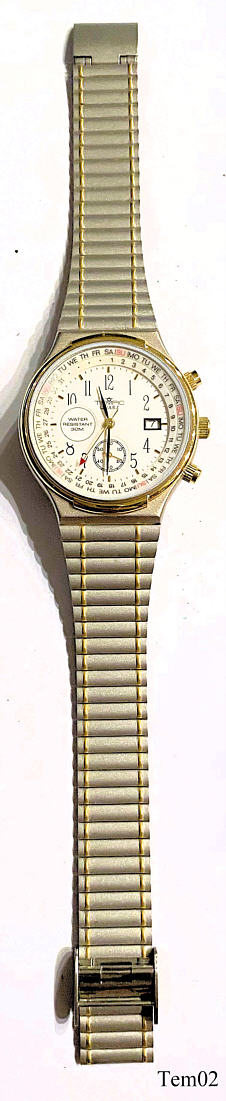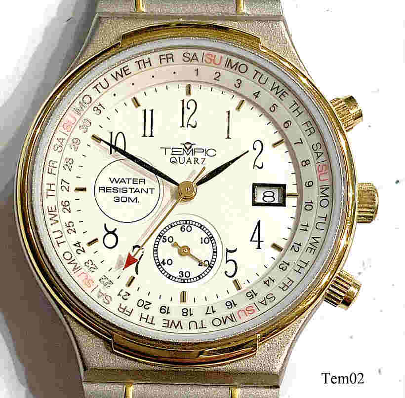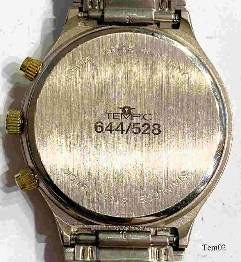 Dies ist eine Herrenuhr von Tempic mit spezieller Kalenderdarstellung. Beschriftet vorn: ”Tempic, Quartz”, hinten: ”Tempic, 644 / 528, 3 ATM Water Resistant, Stainless Steel Back”, innen: ”6641B”. Die Kalenderringe werden über die Knöpfe über und unter der Krone von Hand eingestellt, der Kalender bei der 3 stellt sich Automatisch