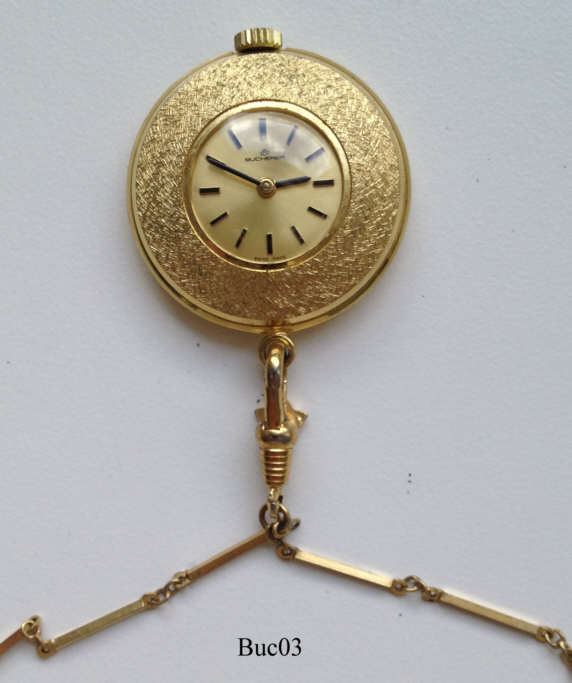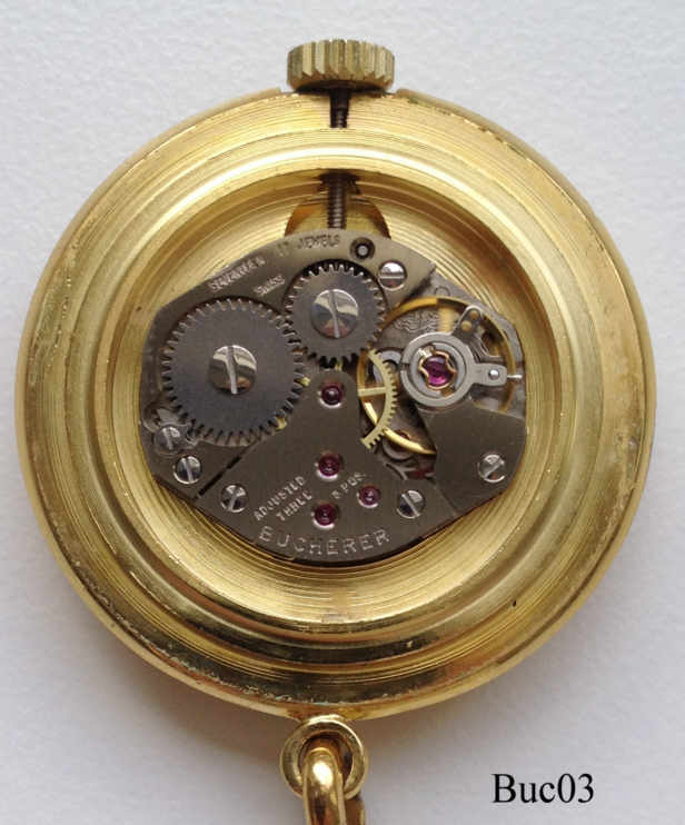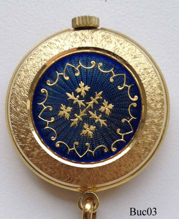 A chainwatch of Bucherer with a long neckchain. There is a nice blue decoration on the back. Signed front: “ Bucherer, Swiss Made”, inside:” Bucherer, Adjusted Three 3 pos., seventeen 17 Jewels, Swiss, FEF 6664”, in the Back: “Bucherer Swiss, 963 4”. Caliber FEF 6664, 21600 Halfbeats.