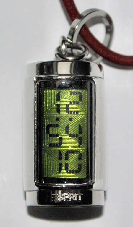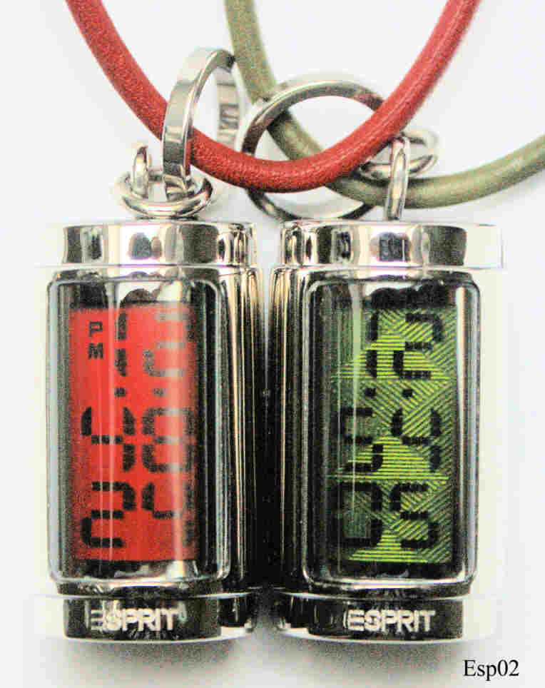 These are two Esprit Ladies Dresswatches, carried as a pendant on a leather necklace. Signed front: ”Esprit”, back: ”Esprit, 139, Water Resistant, 805-Base Metal Bezel and Back”.