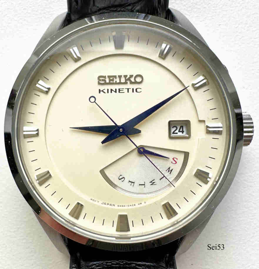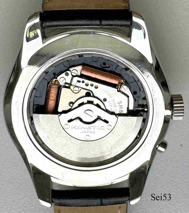 A Seiko Kinetic watch with stainless steel case. A Generator generates, driven through an automatic weight, the energy to load a condensator. This condensator then drives the quartz movement. Signed front: ”Seiko, Kinetic”, back: ”Seiko Water Resistant 10 Bar, Stainless Steel, 5D0355, 5M84-0AB0, Movement Japan”, inside: “5M84A, Seiko Time Corp. Japan, Six 6 Jewels, Seiko, Japan”. Brown leather band.