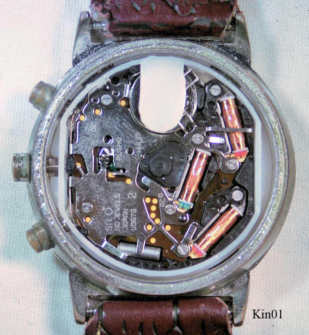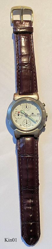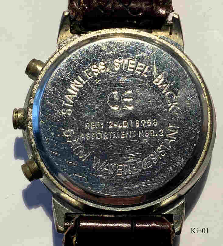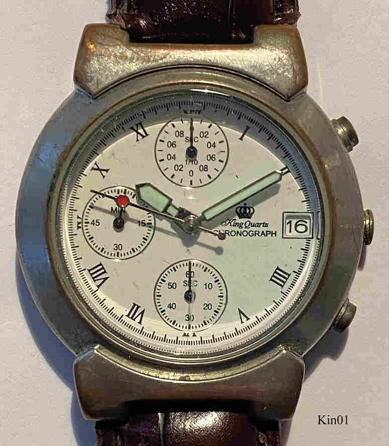 Ein Quartzchronograph der Firma King im Base Metal Gehäuse mit braunem Lederarmband. Beschriftung vorn: ”King Quartz, Chronograph”, hinten: ”Stainless Steel Back, 5 ATM Water Resistant, CE, Ref: 2-LD18953, Assortment Nbr.2”, innen: ”SIIO, No Jewels, Japan, VD57B”.