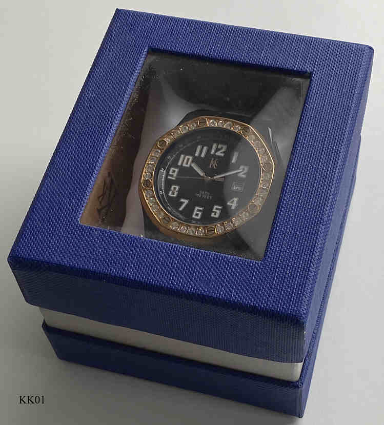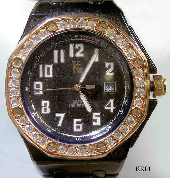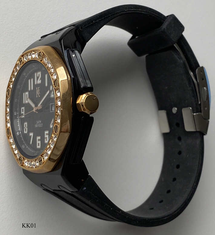 Eine interessante Quartzuhr der Firma KK. Die Designvorlage war sicherlich die Audemars Piguet Royal Oak. Gehäuse Kunststoff schwarz, Zifferblatt schwarz mit Kareemuster und Tachymeterskala, Rand mit Zirkonen und den typischen AP Sechskant- Schraubenköpfen. Sechskantkrone wie AP. Beschriftung vorn: ”KK, 3 ATM, 100 Feet”, hinten: ”KK, Stainless Steel Back, Water Resistant 3 ATM, Italian Design”, innen: ”Japan, No Jewels, Miyota, unadjusted, 2116”. Caliber Miyota 2116.