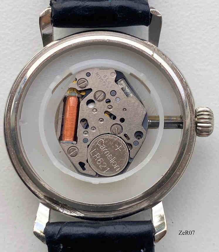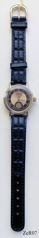 A ZentRa watch with Miyota quartz movement. Stainless Steel case with Onion crown and black leather band. Case Nr.: 022096. Signed front: “ZentRa, Quartz”, back: “022096, 9“, inside: “6L45, Miyota Co.”